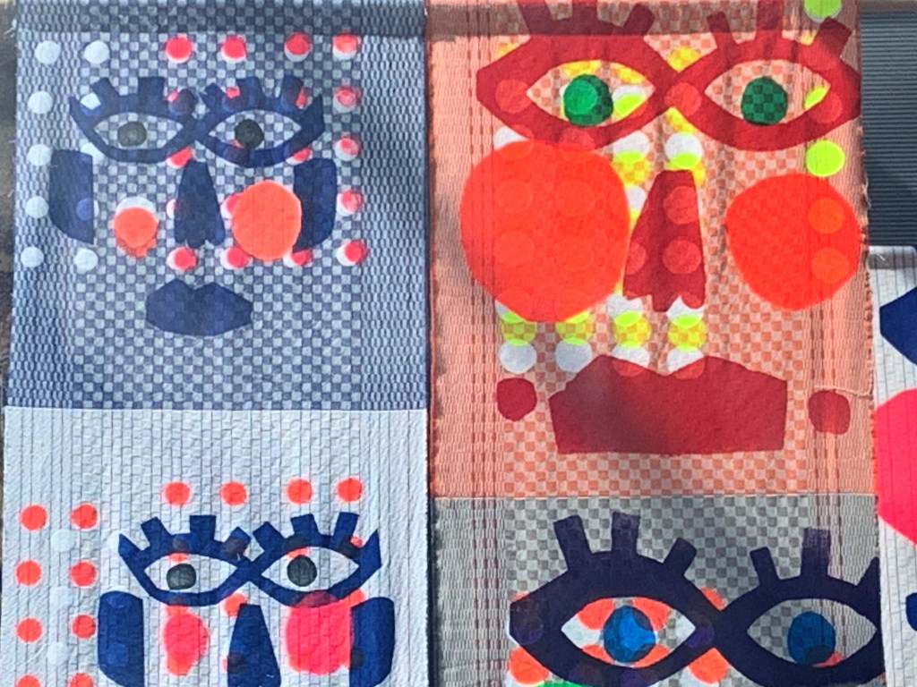 Toen ik binnenkwam, was Marieke bezig aan een grote, van oude shawls gemaakte vlag die bedrukt was met de signatuurhoofden die Diederik erop had geprint. Met naald en draad werd er handmatig rood garen doorheen genaaid. Het werk zal te zien zijn op een mode-evenement in Arnhem.