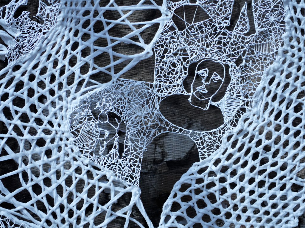 Kunstenaar Thea Zweerink maakt inventief traditioneel wit reuzekantkloswerk en combineert dat met draadachtige figuren en hoofden in prachtige wandinstallaties.