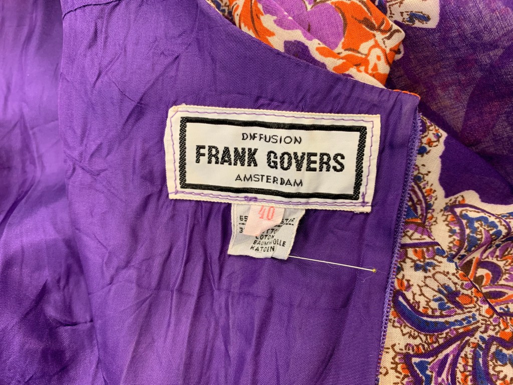 Dat Frank Govers ook andere kleding heeft gemaakt dan de opzichtige glitterjurken waarmee hij bekend is geworden, blijkt uit de bloemenjurk van eenvoudig katoen.