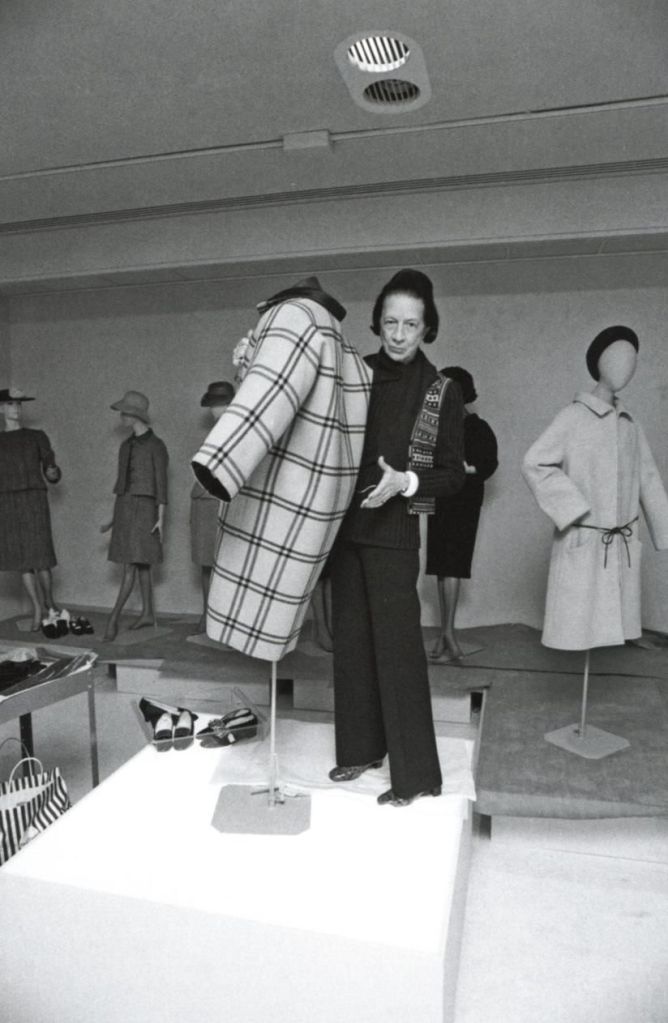 Op deze foto uit 1975 zet Diane Vreeland de jas op een pop voor het Balenciaga retrospectief in Metropolitan Museum of Art in New York