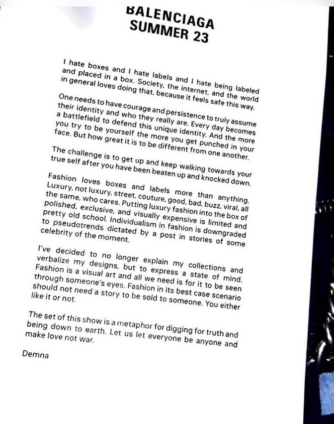 Op de stoelen van de gasten lag bovenstaand statement. Rapper Kanye West opende de show als militair in gevechtstenue. Modellen liepen op houten klompen en delen van de kleding waren met modder besmeurd. Overigens is op 21 oktober j.l. bekend geworden dat Balenciaga de banden met Kayne West heeft verbroken wegens zijn antisemitische uitspraken in interviews en op Twitter.