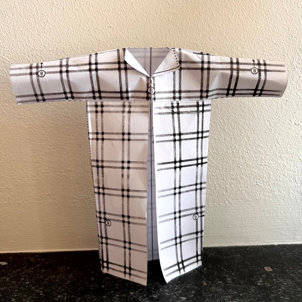 Ik heb het dubbelzijdig uitgeprint en door een aantal knippen en vouwen maakte ik met behulp van wat plakband een klein schaalmodel van de ingenieuze jas die in 1961 is ontworpen.