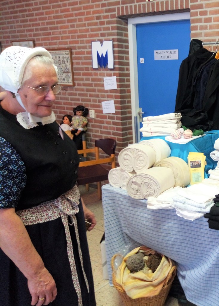 De Nederlandse Kostuumvereniging organiseert elk jaar een textielfeest in dorpshuis De Twee Marken in Maarn. Voorafgaand en na de Algemene Leden Vergadering vindt er een grote Antiek Textiel Markt plaats. Omdat ik lid ben van de commissie Dagen, die dit soort evenementen organiseert, was ik erbij. Mijn taken gedurende de dag: in de ochtend parkeerwacht voor veertig minuten en deurwacht van een uur en ’s middags verkoper van textiel achter de verenigingstafel. Vooral dat laatste heb ik met veel plezier gedaan met mijn mede-verkopers Tirza Westland, Kathleen Mahieu, Dorien Hagedoorn en Eugenie Kips. Zet mij achter een kraam en ik ben weer Jan de Winkelman zoals mijn naam is als ik voor uitgeverij Plint werk.