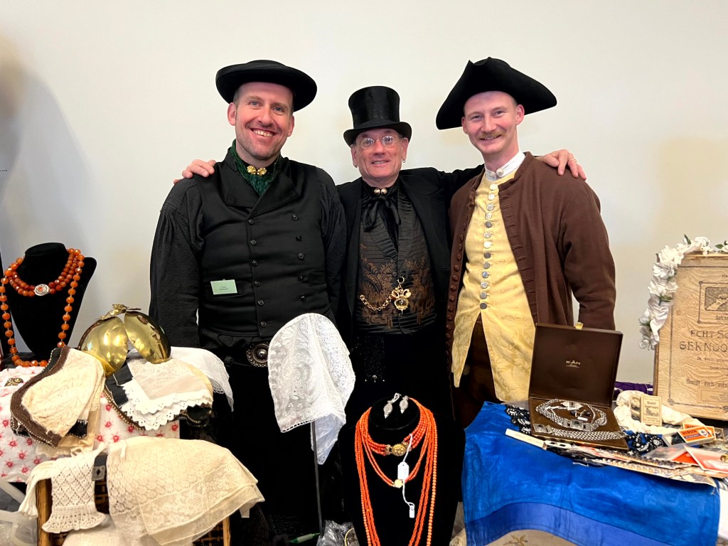 Drie mannen in streekdracht achter een tafel vol schoonheid: Jankees Goud in de protestantse dracht rond 1900 uit Zuid-Beveland, Hans Verberne in Noord-Hollandse dracht en Leroy Bult in een eind 18de-eeuws Fries kostuum.