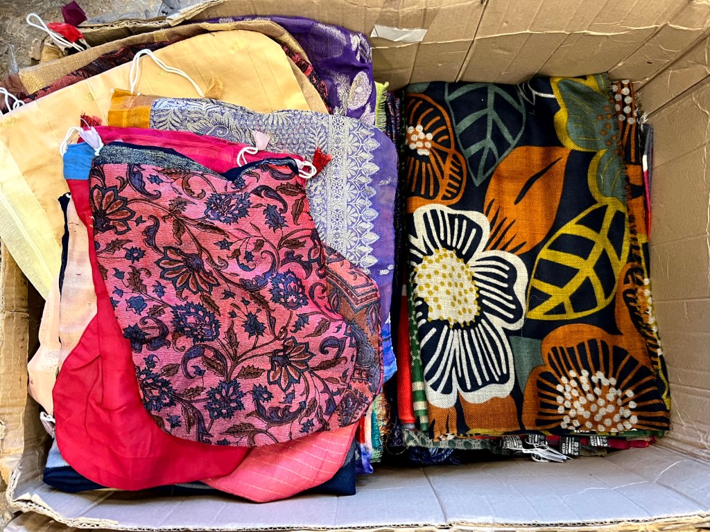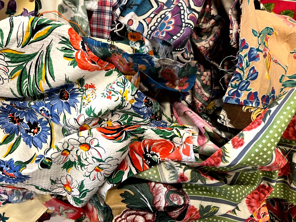 Een doos vol bloemenstoffen die er aan het einde van de dag minder georganiseerd uitzag dan aan het begin van de markt (ik dacht te laat dat ik er toch wat van had moeten kopen).