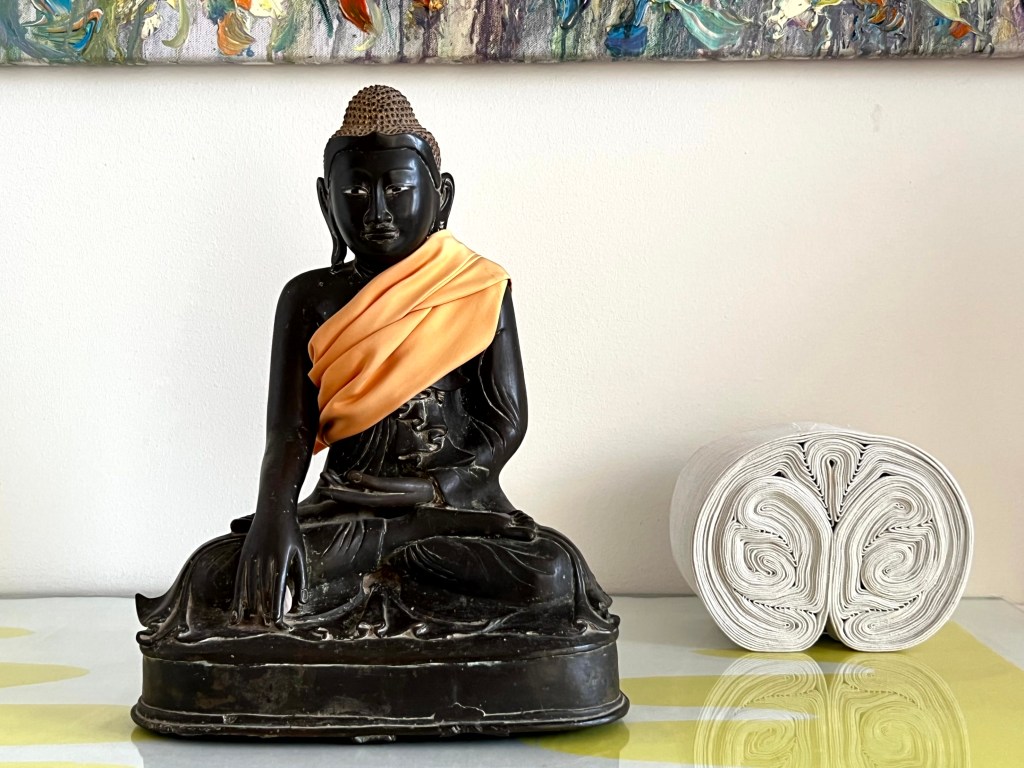 Toen ik ze met een lach vroeg hoe ze een rol voor een huwelijk van twee mannen moesten rollen, hadden ze niet direct een antwoord, maar daar zouden ze over nadenken. ‘Welke vinden jullie de mooiste?’ vroeg ik. ‘Deze,’ zeiden ze, ‘omdat hij mooi strak is gerold en je de figuren goed ziet.’ Het is een object dat ook gewoon prachtig in de kamer zal staan; het hoeft beslist niet in een linnenkast te liggen, dacht ik. ‘Die wil ik graag,’ hoorde ik mezelf zeggen. Zonder dat ik er om vroeg , ging er ook nog wat van de prijs af.