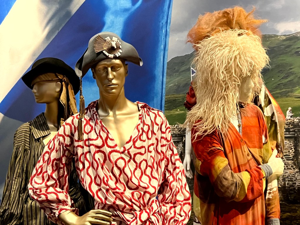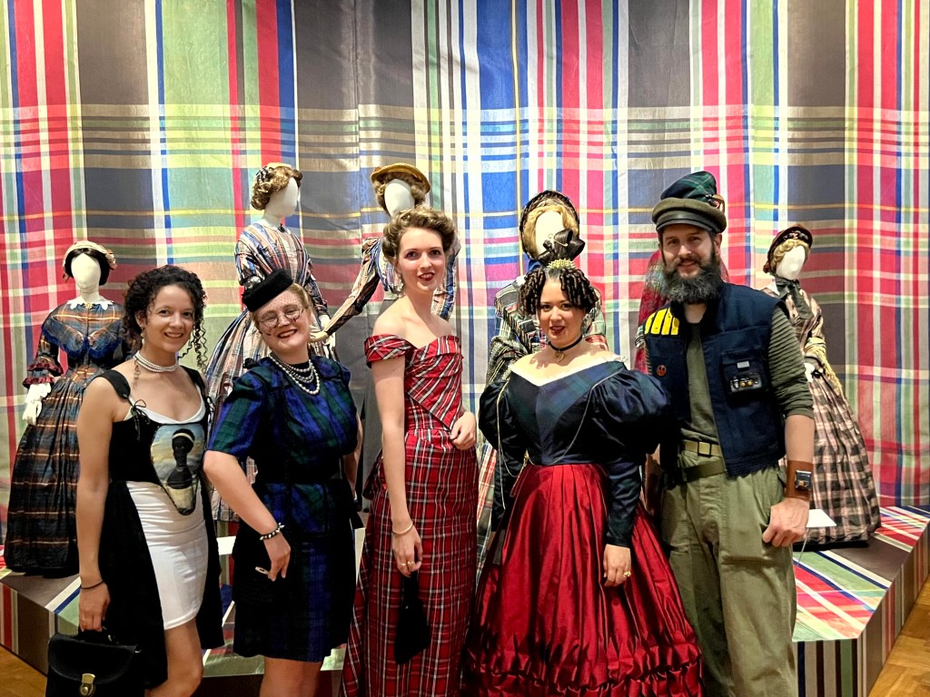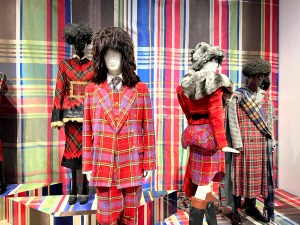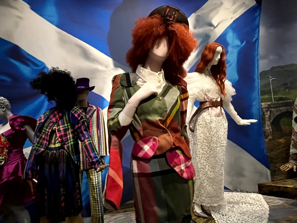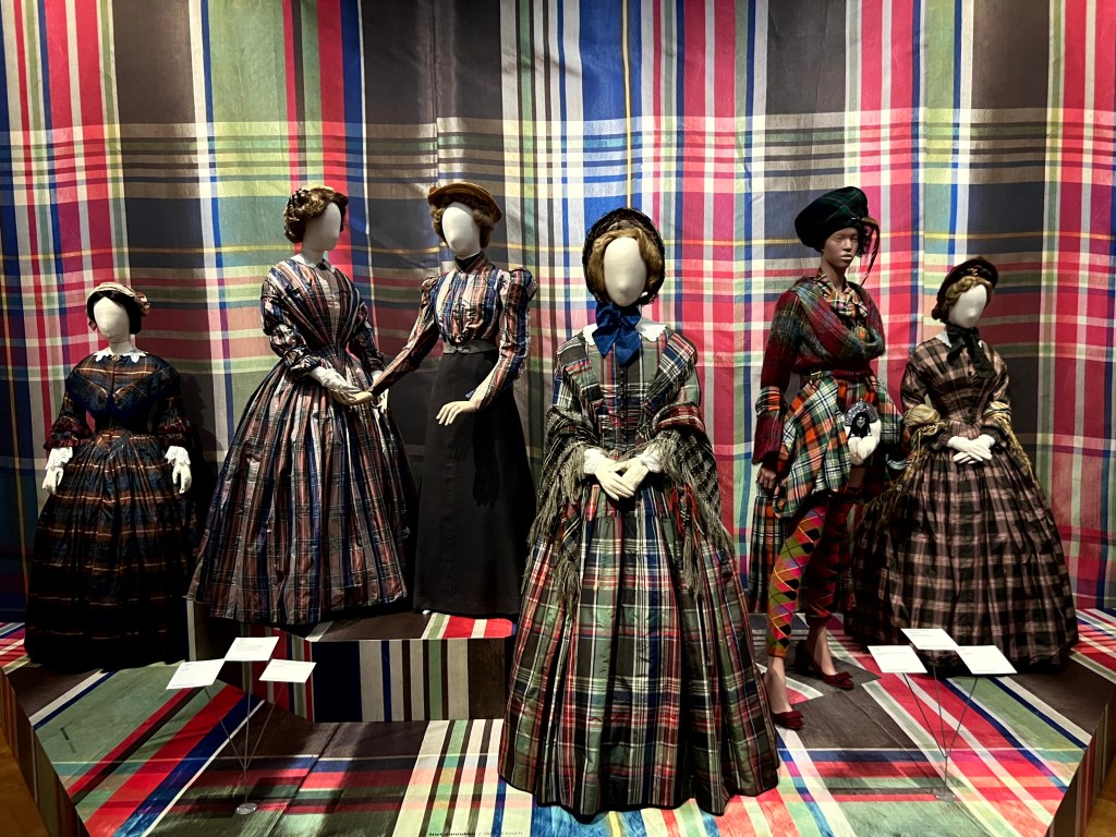 Jurken uit de 19de eeuw in prachtige ruiten staan tegenover moderne kleding in spetterende tartans. Dat maakt de hele tentoonstelling fris en modern.