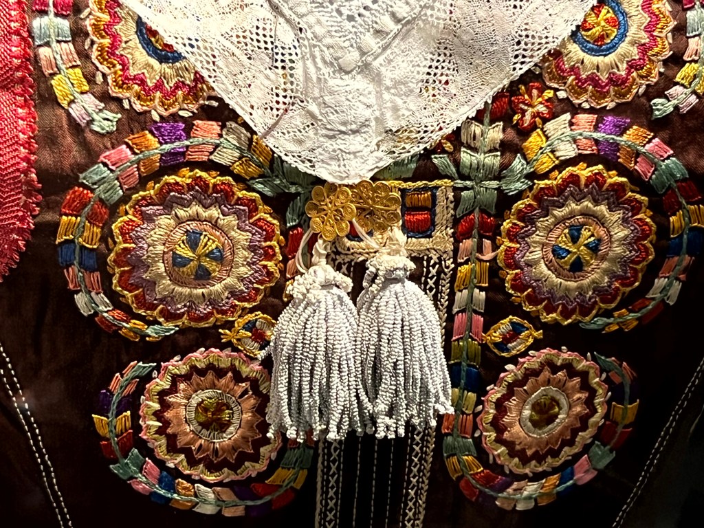 Waarom haar schort zo gevouwen werd, is tot vandaag onduidelijk. Niet alle knopen van het jak van de bruidegom zijn dicht. Over zijn mouwen draagt hij ‘steekmouwen’, die zijn bessie nog heeft gemaakt.