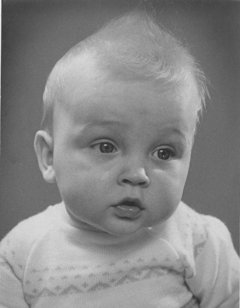 Ik heb bijna geen foto’s uit mijn baby- en kindertijd. Toch is er die babyfoto waarop ik dromerig de wereld inkijk. Ik draag een wit, gebreid truitje met ingebreide, lichtblauwe figuurtjes. Er hoorde een blauw, gebreid broekje bij. Uit verhalen weet ik dat het mijn dooppakje was. Ik was te groot voor de doopjurk. Natuurlijk herinneren ik me niets van mijn doop; ik schijn gehuild te hebben. In de linnenkast op de slaapkamer van mijn ouders lag een doos met mijn dooppakje. De motten hebben erin huis gehouden en tijdens een verhuizing is het weggegooid. Maar in mijn herinnering zie ik het nog voor me.