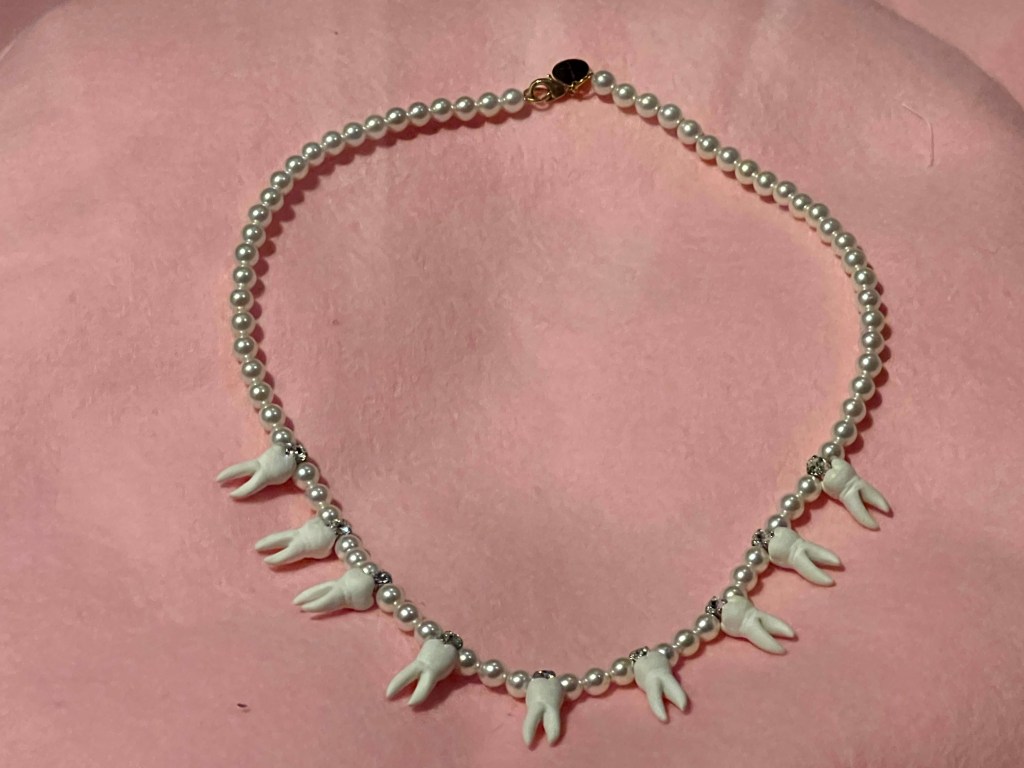 Een collier van porseleinen melktandjes komt uit dezelfde collectie.