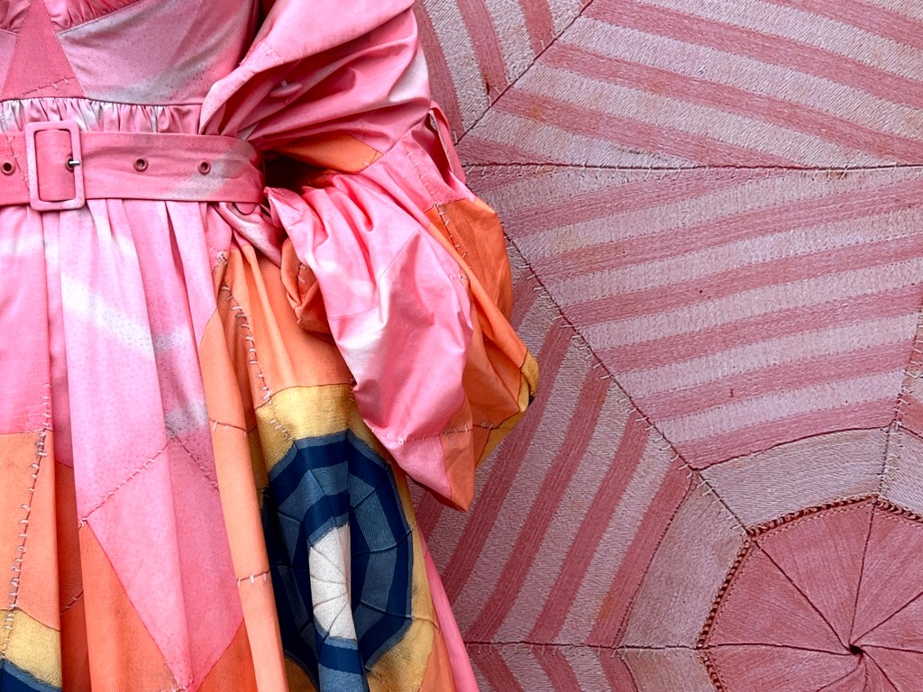 Gestreepte, achtkantige vormen werden door de kunstenaar aan elkaar genaaid. Met dit patroon ontwierp Simone Rocha een collectie jurken die een mooie verbinding aangaan.