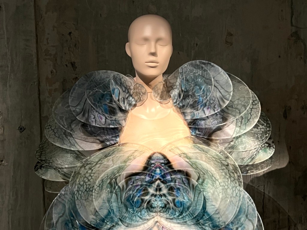 Je loopt langs jurken die, als je er langs gaat, langzaam bewegen en waar duidelijk de invloed van de zee in te zien is.
