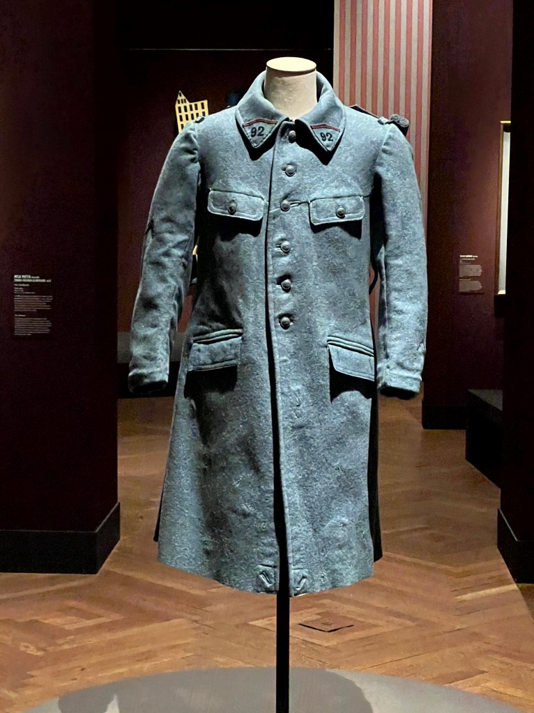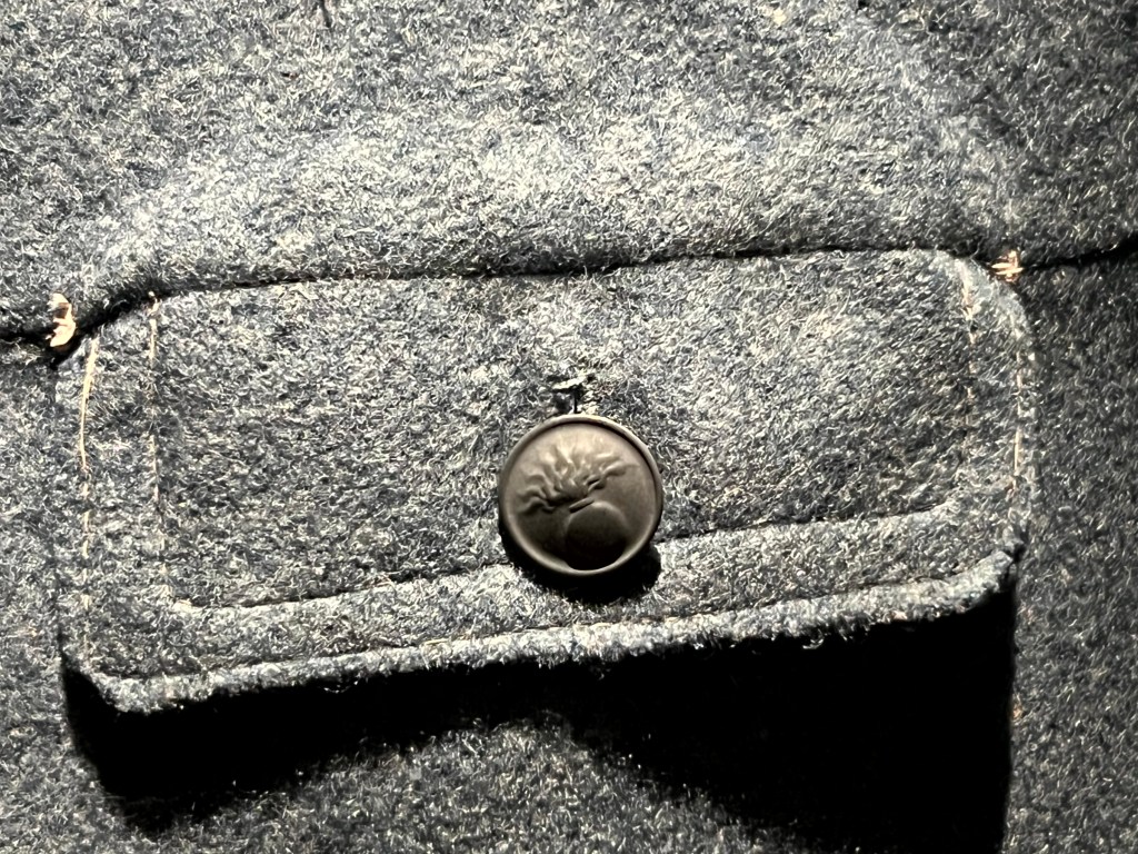 In het midden van een zaal stond een duidelijk militaire jas die direct mijn aandacht vroeg. Hij is gemaakt van blauwe, wollen stof met de naam ‘blue horizon’. Op de jas zogenaamde granaatknoppen met een afbeelding van een granaat met gespreide vlam.