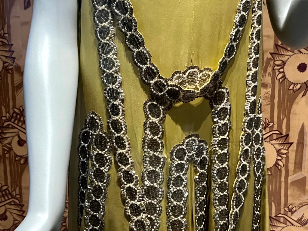 Ingenieus vond ik het gebruik van de rood-zwarte streepstof in het ontwerp van Patou en het kralenborduurwerk op de feestelijke schuin van draad geknipte japon van Vionnet.