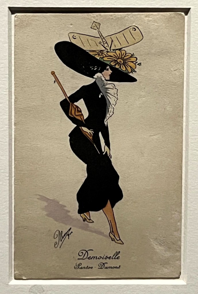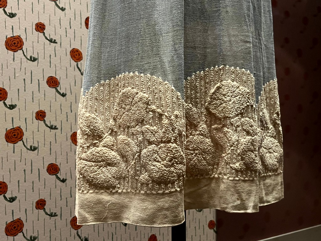 Zelf vond ik de geborduurde top met muts, gedragen door zijn echtgenote Denise Poiret, prachtig door het gestileerde patroon van bloemen. Het behang op de achtergrond is een kopie van een origineel Poiret-ontwerp, gemaakt voor zijn interieurbedrijf Atelier Martine dat hij naast zijn couturehuis dreef.