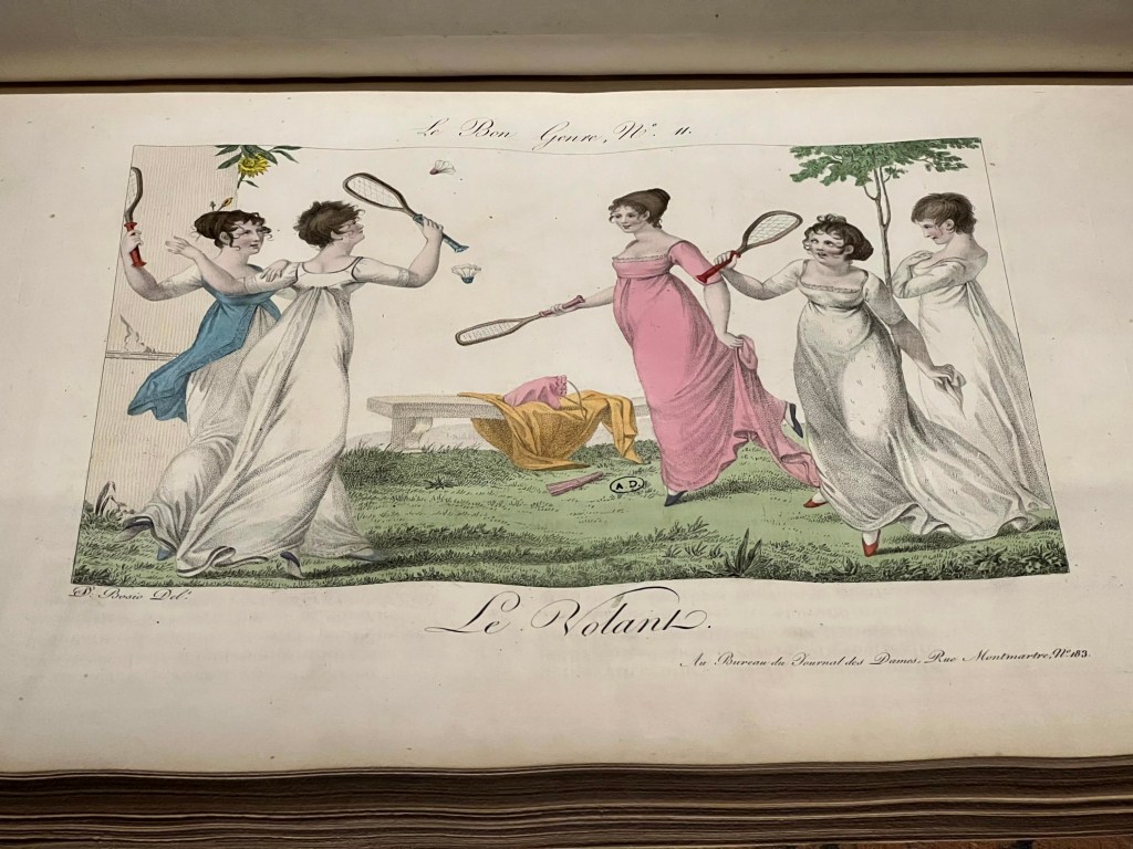 Op een gravure uit de 18de eeuw badmintonnen vrouwen in empirejurken. hoe onhandig moet het zijn geweest om in zulke nauwe jurken heen en weer te rennen.