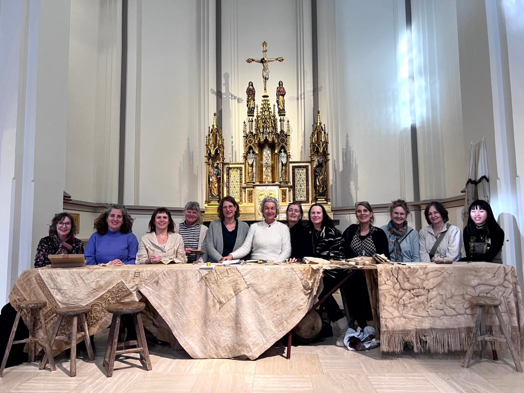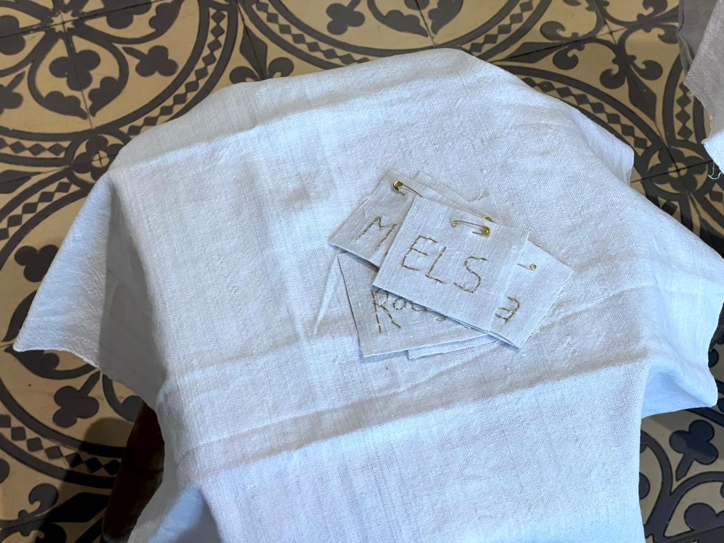 Voor alle deelnemers aan de lezing had ik met gouddraad op oud linnen hun naam geborduurd. Bij binnenkomst in de kapel kregen ze die opgespeld.