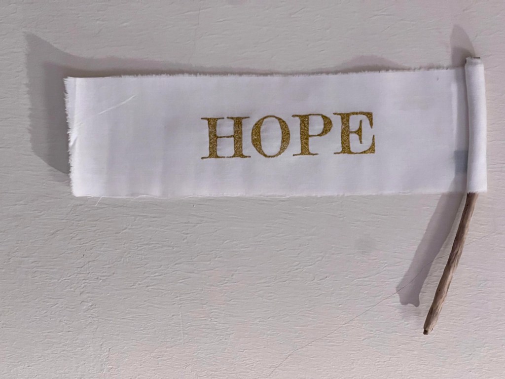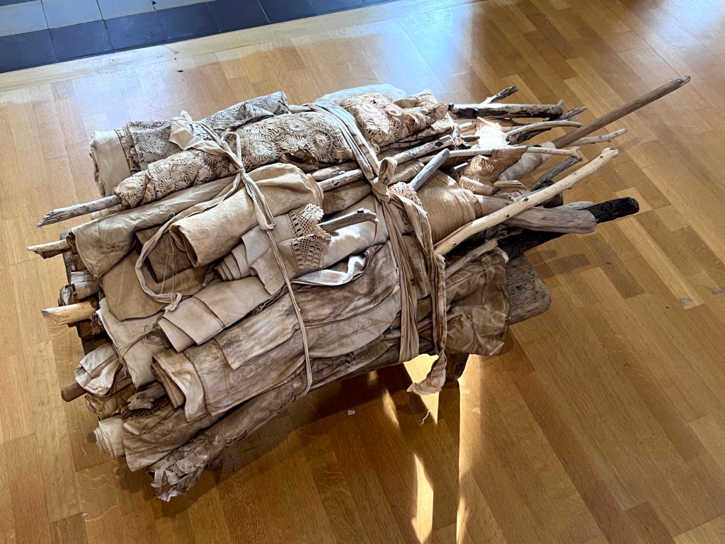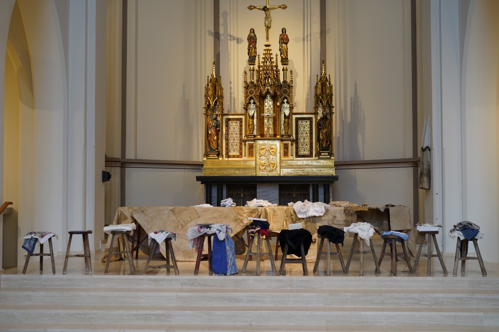 Zondagmorgen begon ik met de voorbereiding van de lezing in de kapel. Op twaalf krukjes verborg ik onder oude handgeweven linnen theedoeken uit Slowakije mijn textielverhalen.