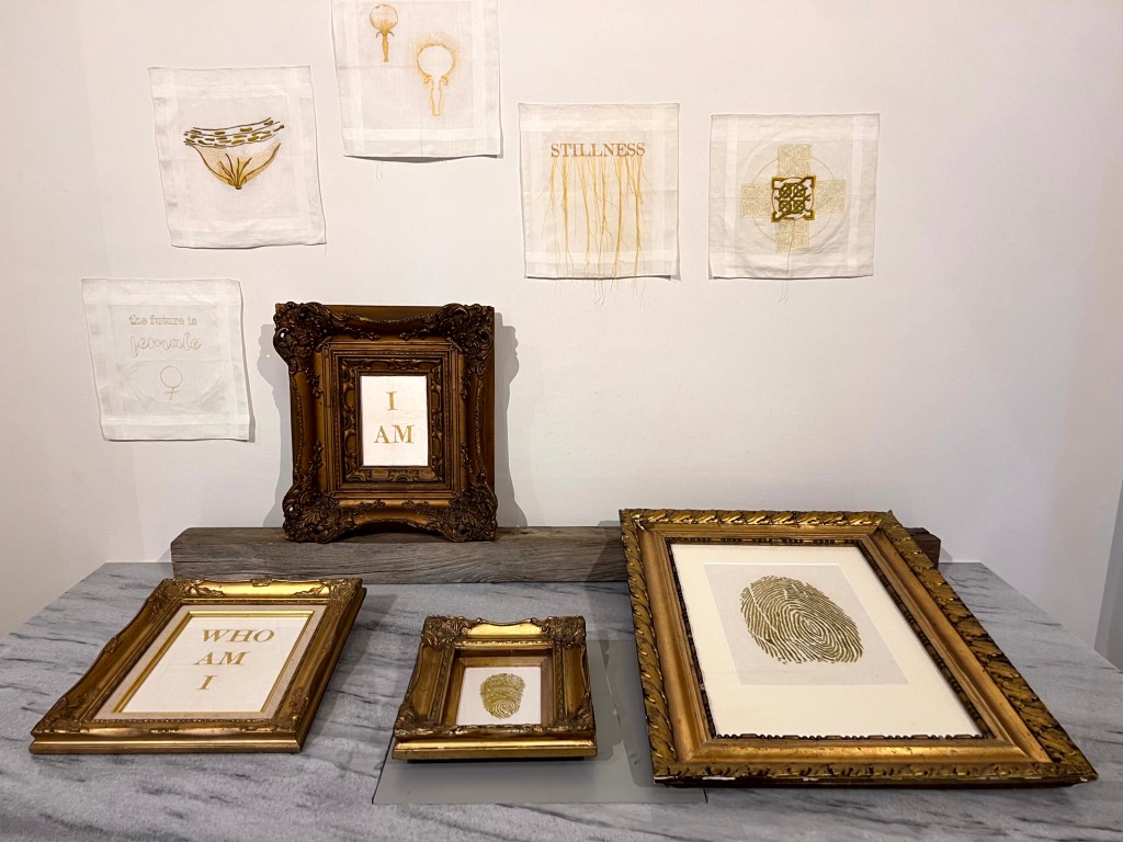 Een groot gouden altaar, een lange tafel waaraan werd geborduurd, gouden borduursels en andere kunstwerken aan de wanden, op tafels en in de ruimte.