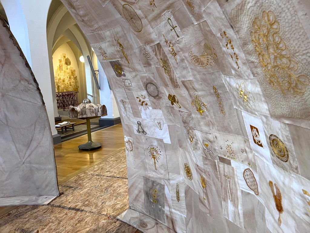 Textielboeken vol geborduurde symbolen die een plaats krijgen in de tempel