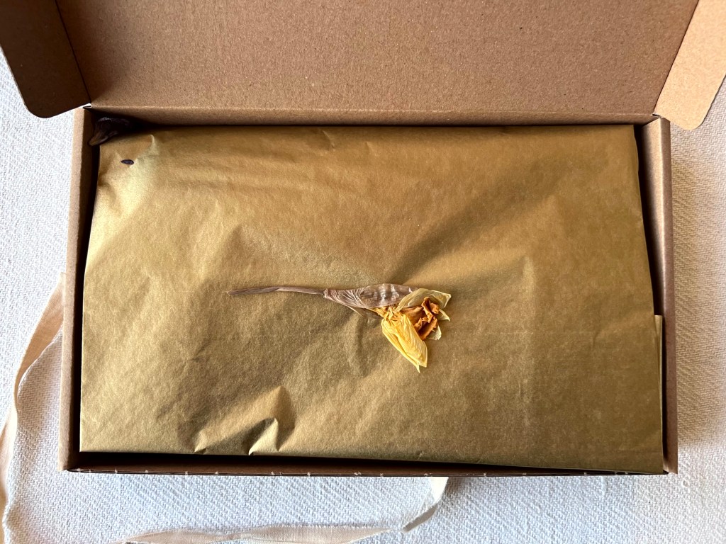 Natuurlijk ga ik mee borduren aan dit bijzondere project. Een borduurbox ging mee naar huis. Toen ik die openmaakte, lag er een kleine gedroogde narcis en onder goudpapier het teken dat ik ga borduren.