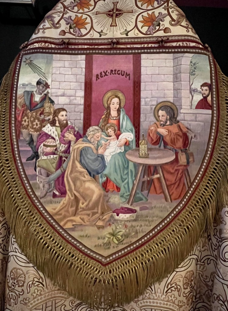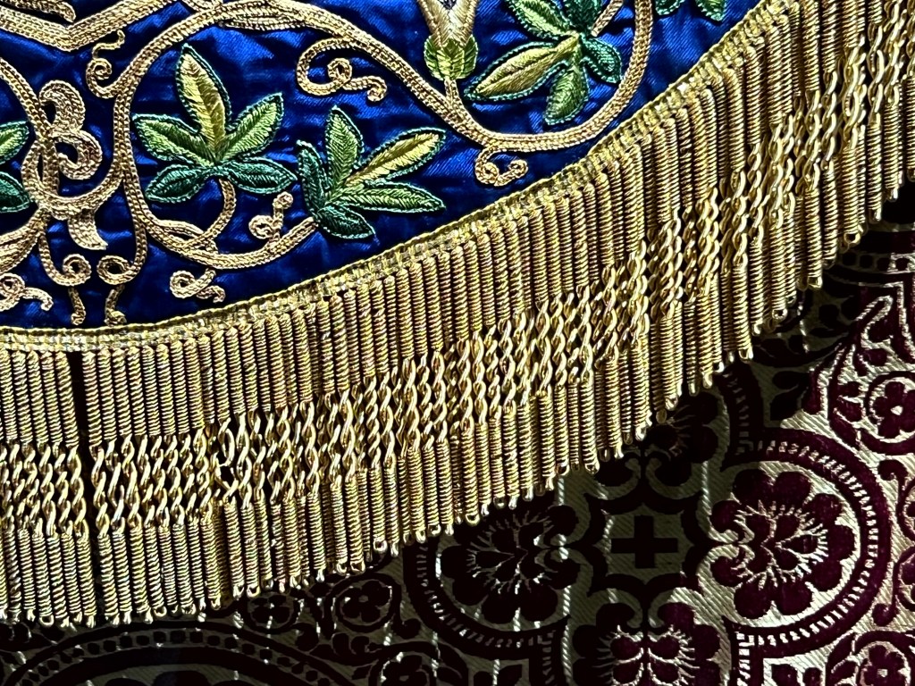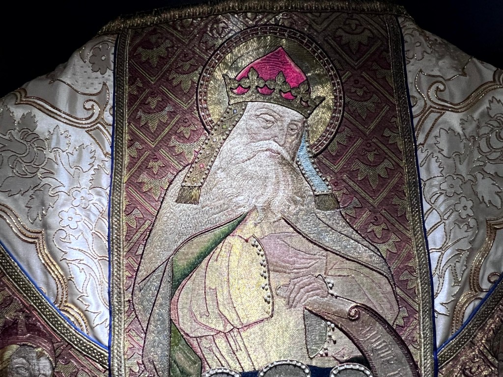 De mooiste zijden damast vol ingeweven dessins werden gebruikt voor deze liturgische kleding waarop dan ook nog glimmend goudborduursel werd gezet.
