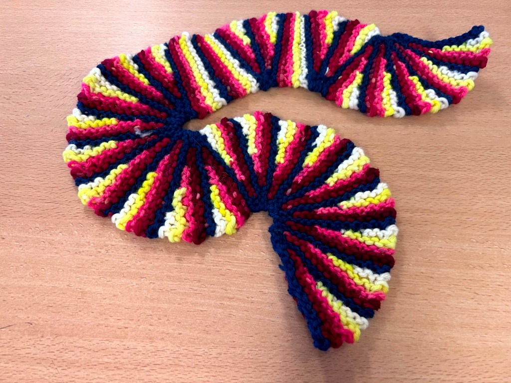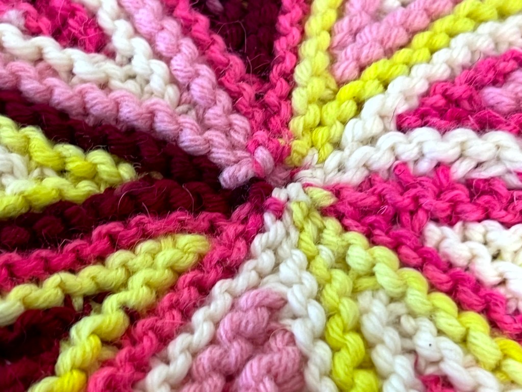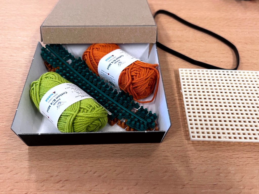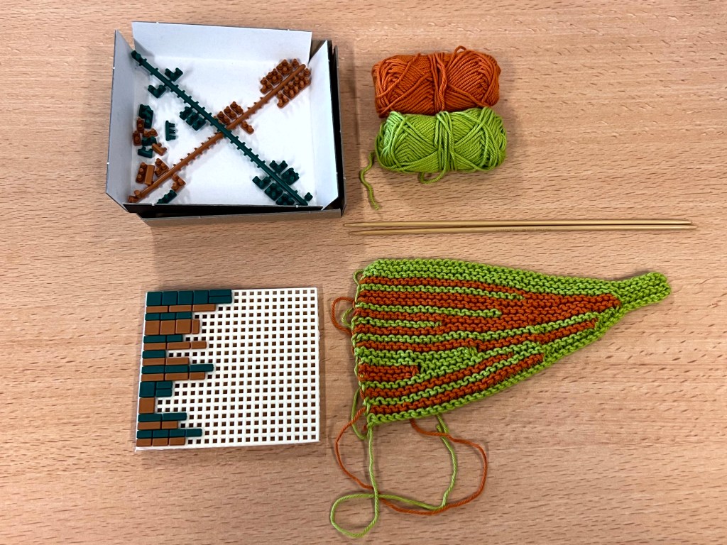 In het doosje zaten twee bolletjes garen en plastic mozaïeksteentjes. Daarmee maakten we een toerenpatroon dat we moesten nabreien. Een slim systeem om snel een ontwerp te hebben. Ik kreeg de ‘German Shortrow’ helder uitgelegd en had er veel plezier in.