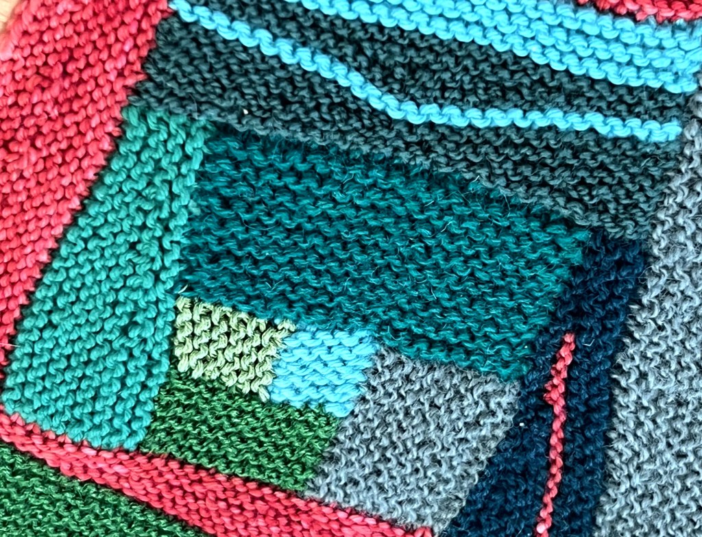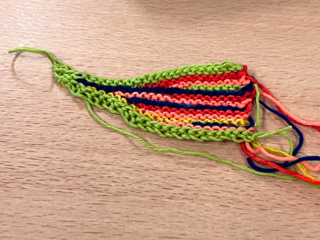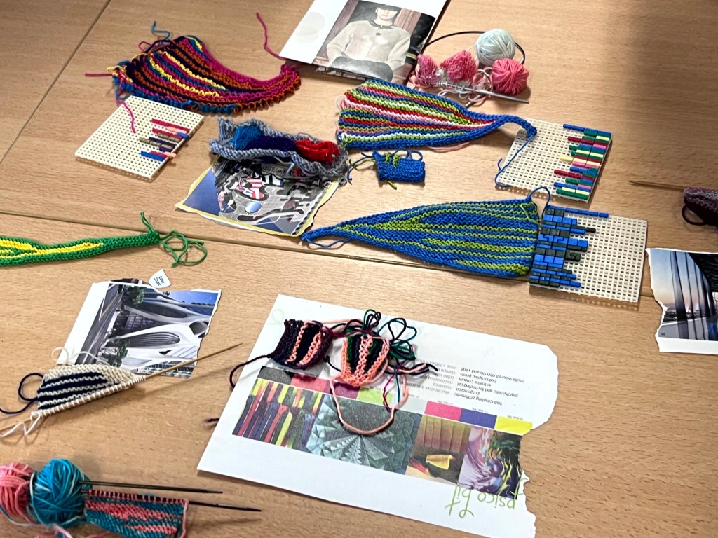 Aan het einde van de middag kwam al het kleurige werk op tafel. Heel verschillend en leuk om goed te bekijken. Broodje breien geeft je veel inspiratie. Loret laat veel voorbeelden zien en natuurlijk leer je ook van je medecursisten. Ik heb volop genoten en wie weet ga ik de techniek verder ontdekken en gebruiken.