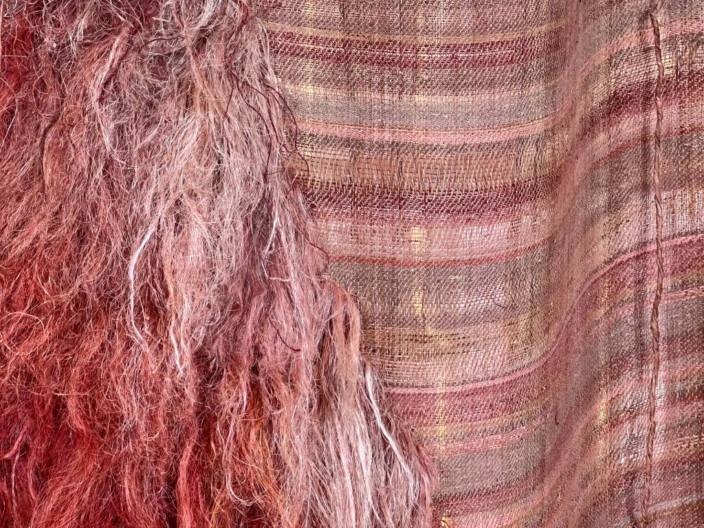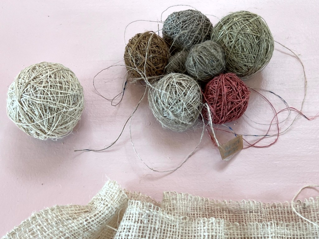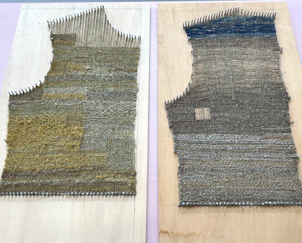 Plantaardig gekleurde garens die verwerkt worden in een gezamenlijk jasproject.