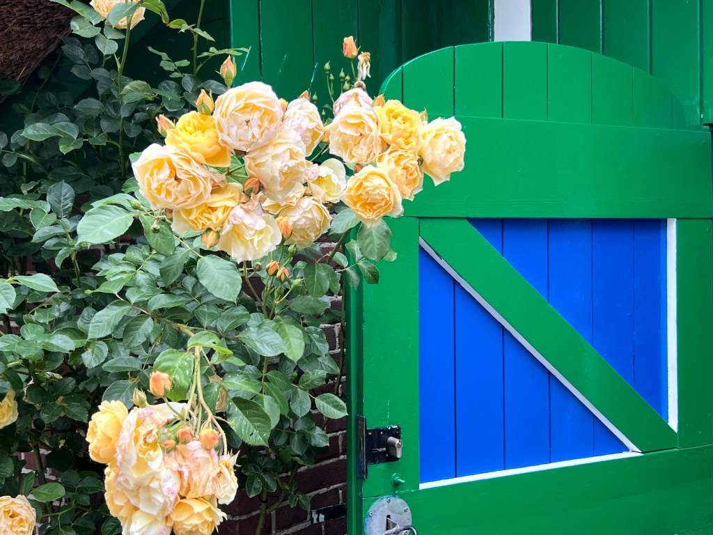 Toen we na het bezoek naar Rouveen reden, werd ik weer getroffen door het groen en blauw van de huizen. En als er dan ook nog een schitterende gele roos bij bloeit, is het plaatje helemaal compleet.