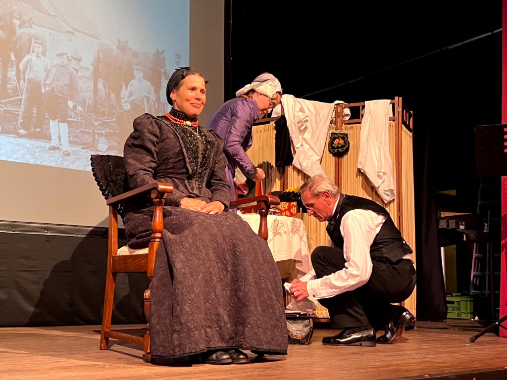 Toen de gewone vrouw als laatste haar schort ombond en de ondermutsen en boerenhoedje opgezet kreeg en de rijke dame de kap met hoed op kreeg, was het tijd voor de staatsiefoto.