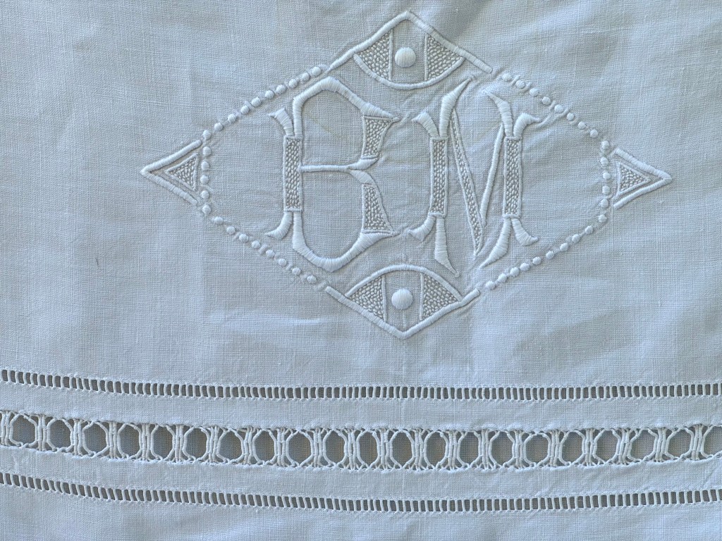 Mijn keuze had schitterend opengewerkte randen en zogenaamde spinnetjes in de hoeken. Wat een werk moet het zijn geweest om zoiets te maken. Heel goedkoop is zo’n laken niet meer, maar je hebt dan wel een groot en onverslijtbaar laken voor de rest van je leven, een tactiele en visuele beauty van de hoogste klasse.