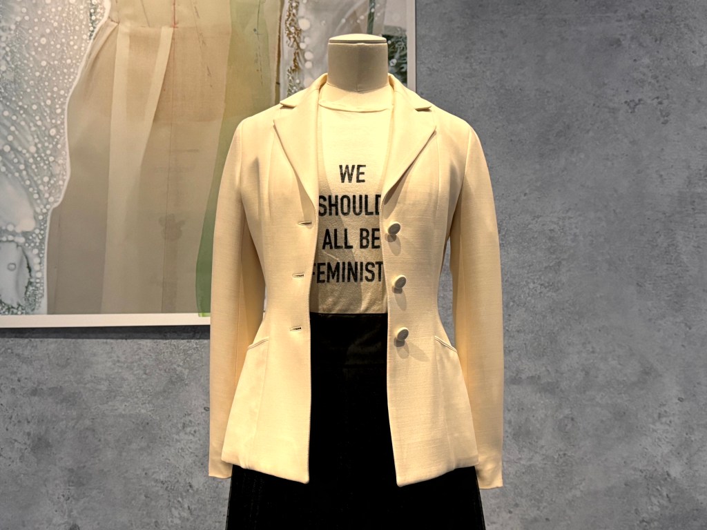 Een zachter silhouet met een activistische tekst door Maria Grazia Chiuri.