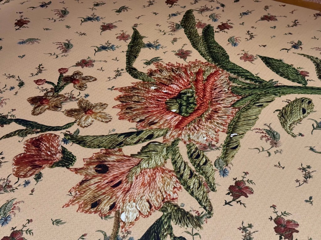 In de bloemenzaal op de tentoonstelling waar al die bloemrijke ontwerpen staan, vind je zelfs bloemen op de vloer: uitvergrotingen van borduursels op jurken.