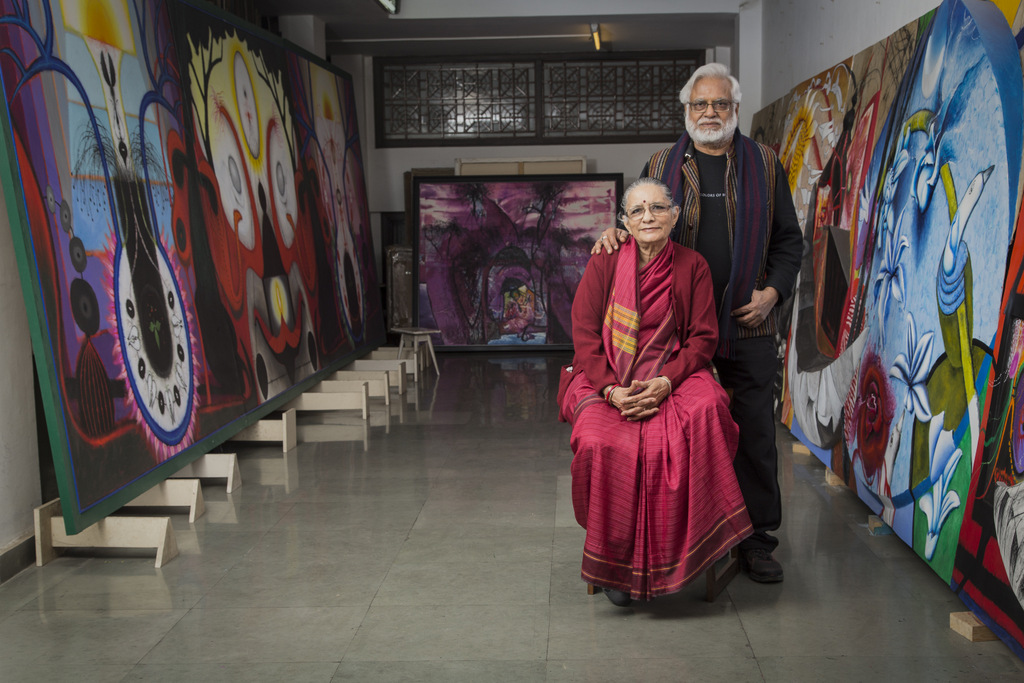 Madhvi Parekh (1942, Sanjaya) trouwde op haar 15de met Manu Parekh (1939, Ahmedabad). Zij autodidact, hij afgestudeerd aan de kunstacademie van Mumbai in 1962. Sinds 1974 leven en werken ze in Delhi.