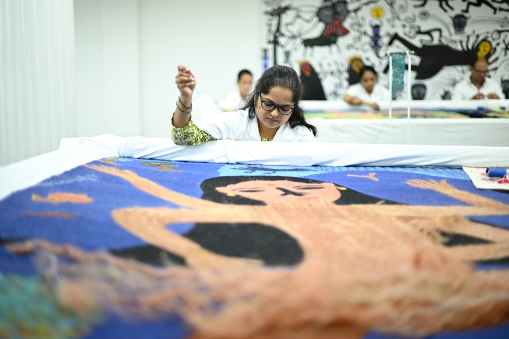 De wandkleden van Manu Parekh zijn totaal anders. Ze voert je mee naar een wereld die voor een westerling onbekend is.
