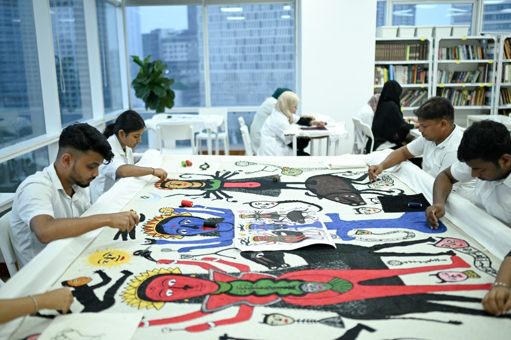 Een studente werkt aan het wandkleed hier boven. Het is haar afstudeeropdracht. Foto: Hashim Badani