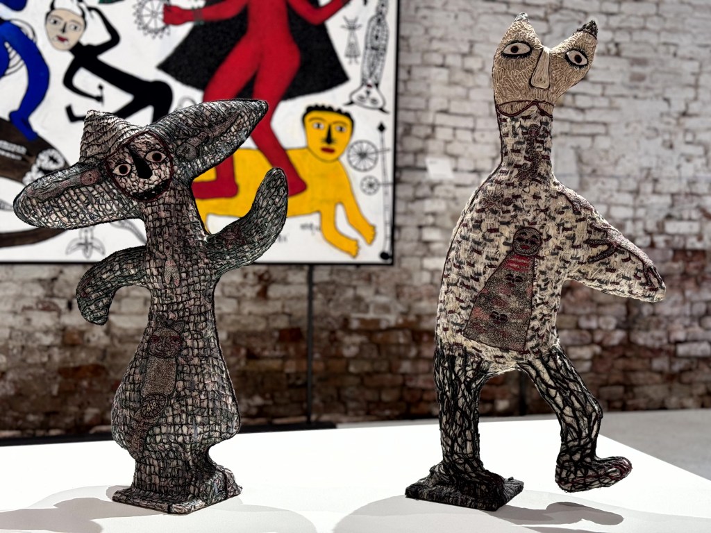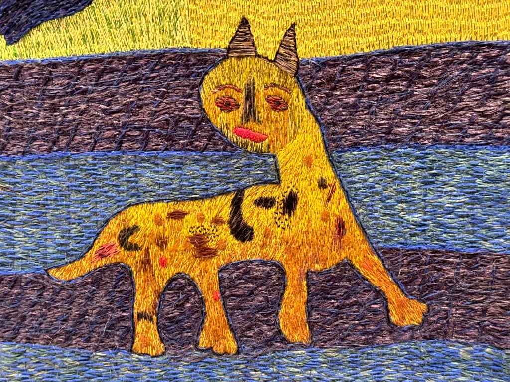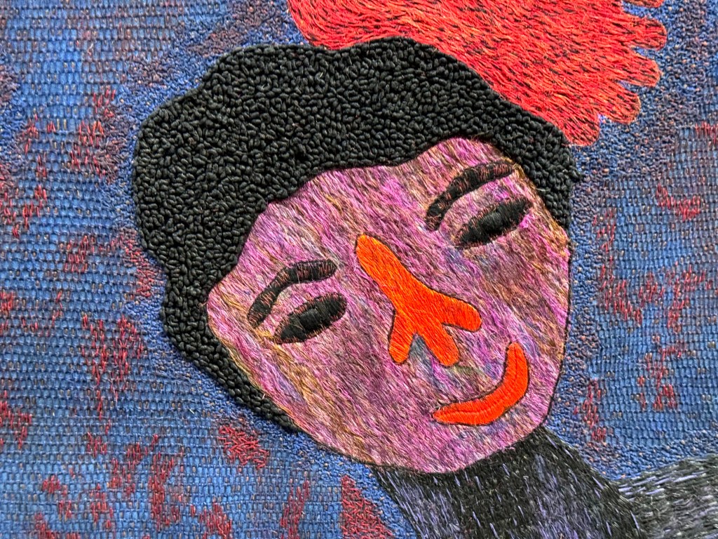 Daar waren van hun schilderijen grote, geborduurde wandtapijten gemaakt die de muren van de ruimte deden trillen. De show was goed, maar de enorm grote borduursels bleven me meer bij.