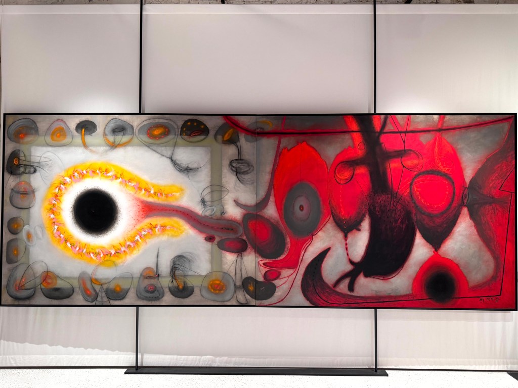 Zijn schilderijen, abstract expressionistisch.