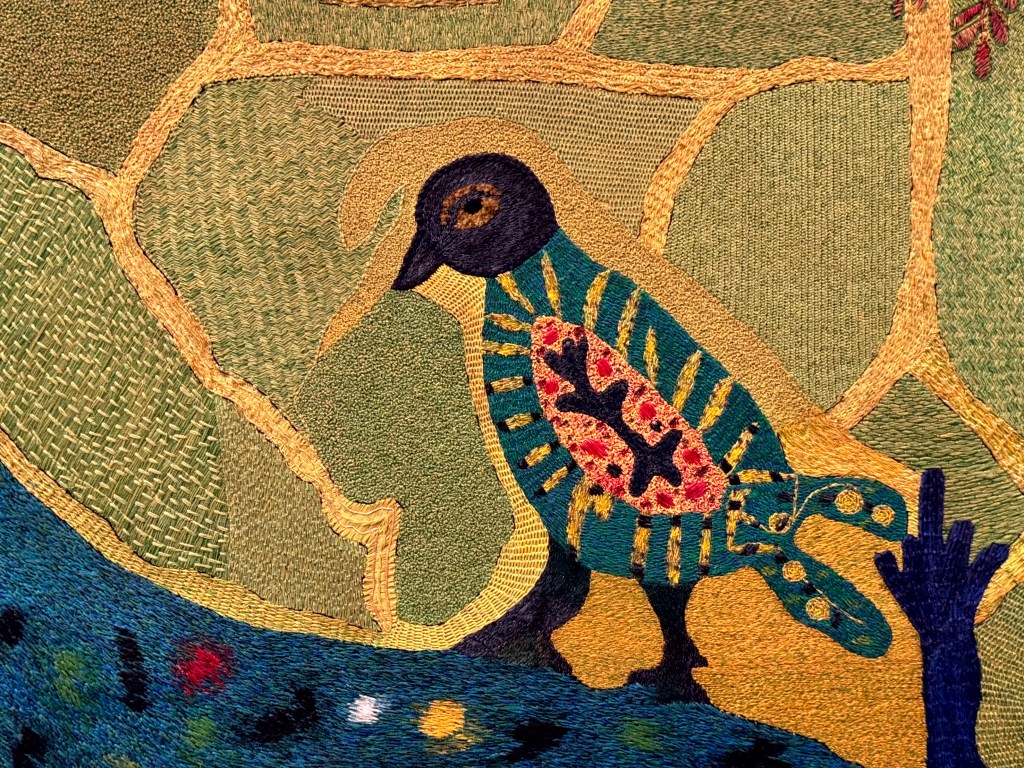 Duizelingwekkende verschillende borduursteken in allerlei materialen dansten voor mijn ogen op dat enorme doek. Wat een feest om dit te zien en het was nog maar het begin.