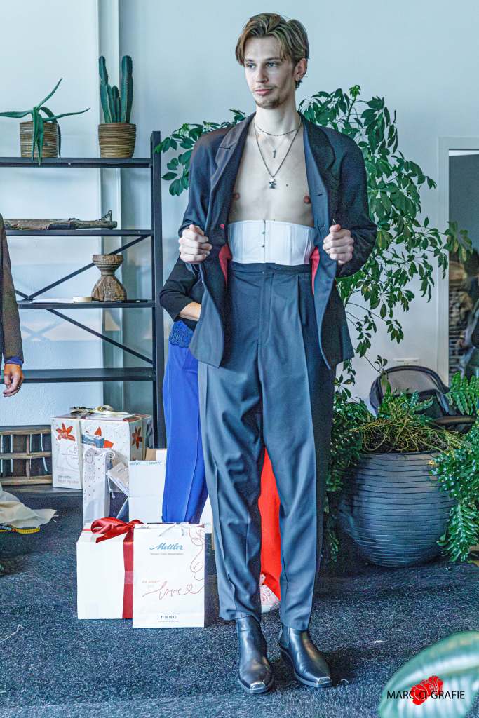 Daaronder droeg hij een zelfgemaakt korset wat de vorm benadrukte.