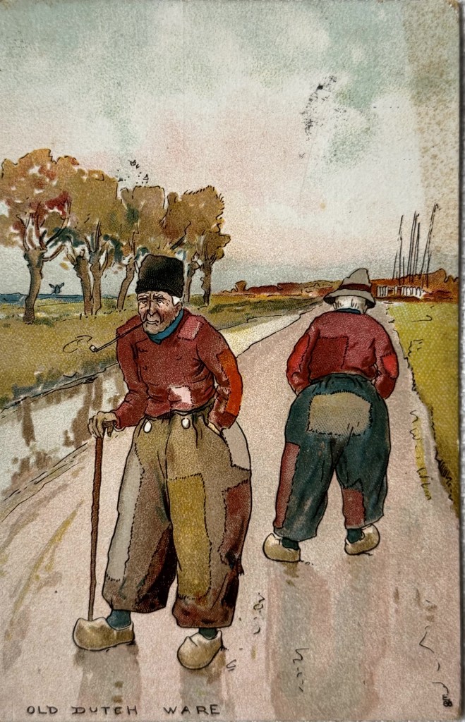 Een voorbeeld van reparatie is ook te zien op een oude getekende ansichtkaart van begin 1900 met twee mannen in duidelijk opgelapte broeken en jakken. Old Dutch Ware oftewel Oude Hollandse Waren staat erop geschreven. Het zouden mannen uit Volendam kunnen zijn. De man links draagt op zijn hoofs de winterse ruige muts, maar zijn jak, de zogenaamde polkabaai van katoen, is een kledingstuk dat in de zomer wordt gedragen. Zijn pijbroek klopt van kleur niet, want die is altijd zwart. Wat wel klopt is de broeklengte tot de enkels. De lappen op de broeken geven goed aan waar slijtage plaats vond.