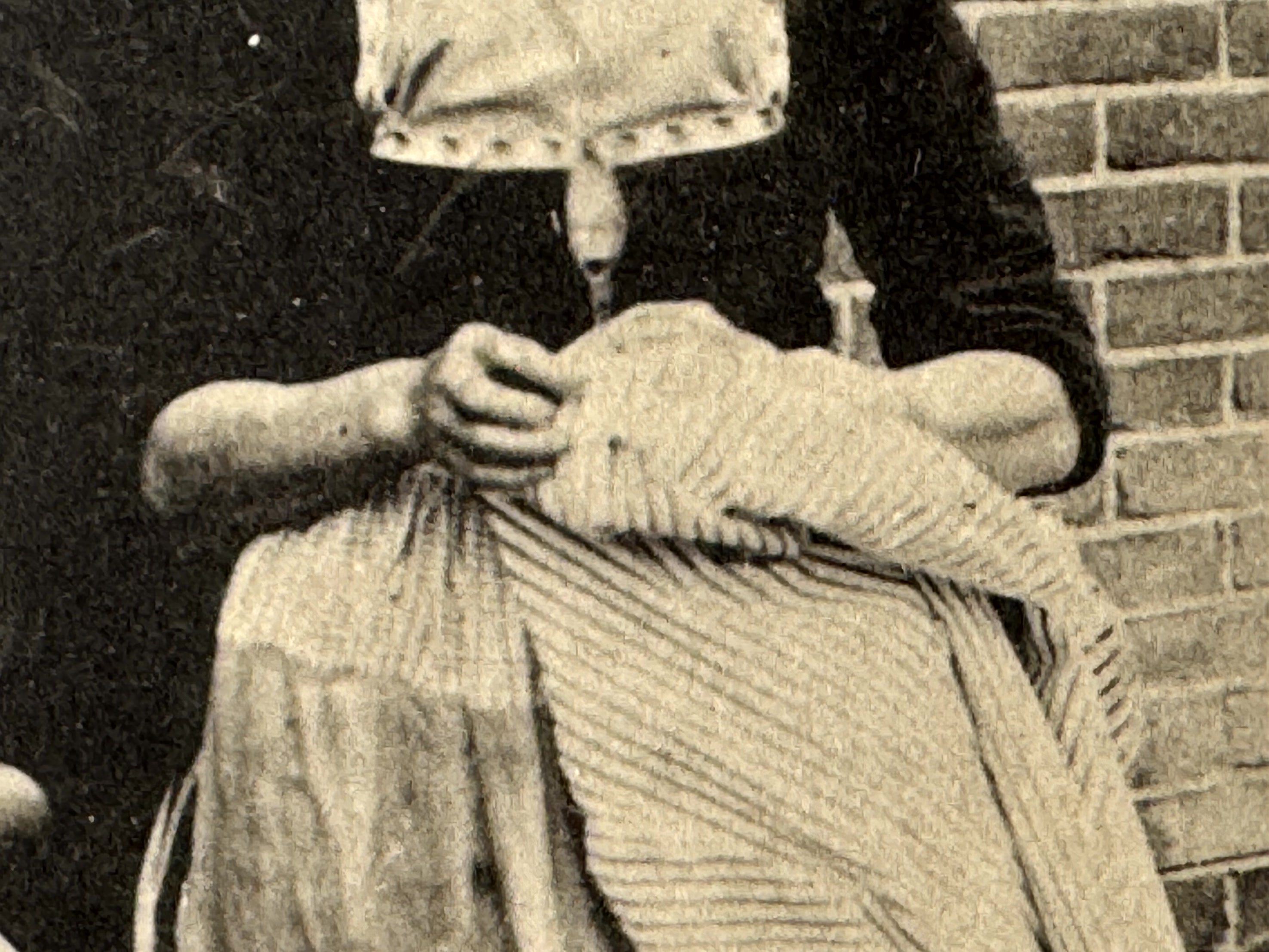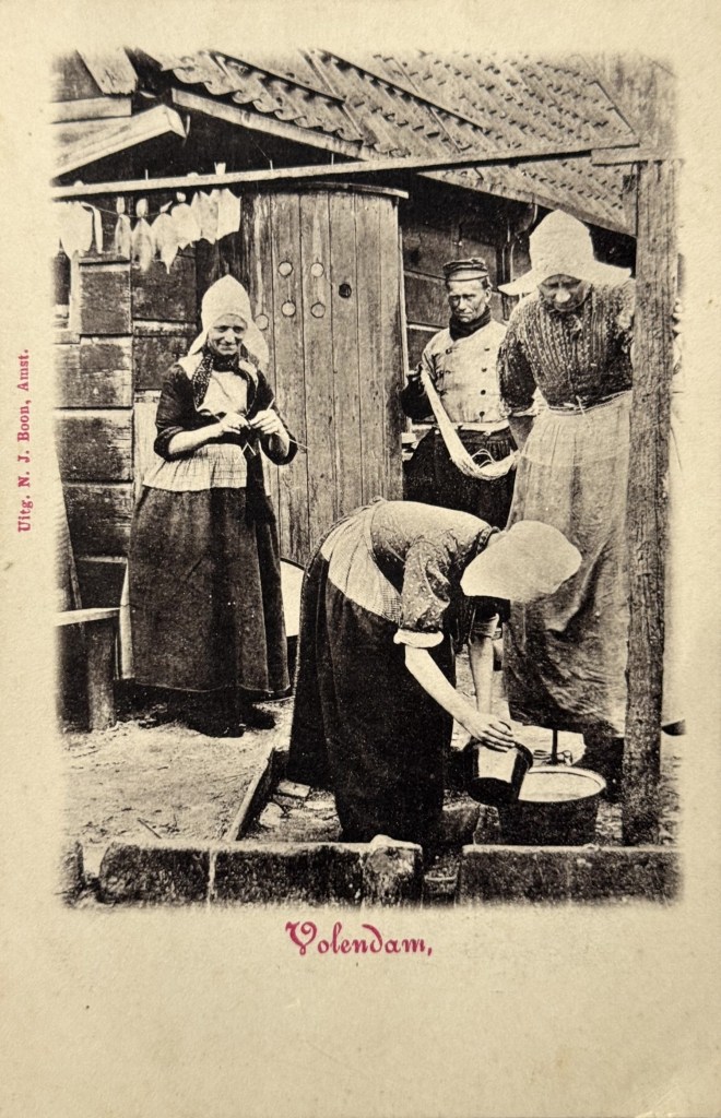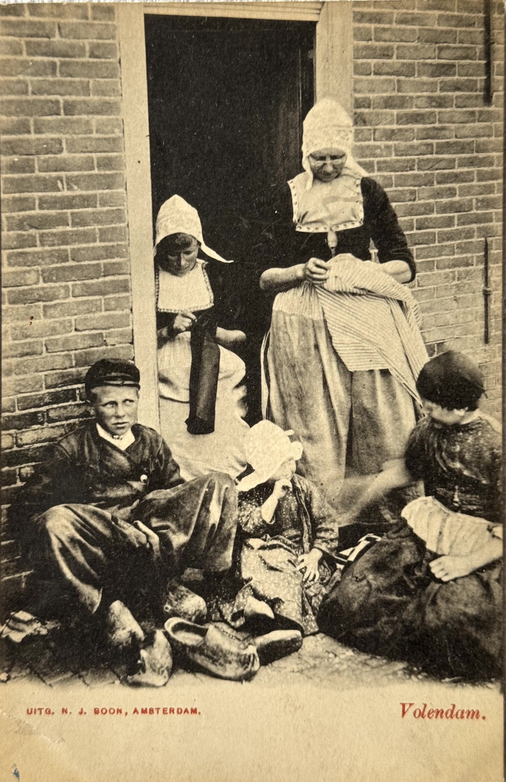 Op een andere kaart zie je dat twee vrouwen iets van textiel in hun handen hebben. De rechter vrouw lijkt iets te doen dat op naaien lijkt. Zou ze een scheur in een schort repareren? Boeiend om zo een inkijk te krijgen in het leven in Volendam rond 1900.