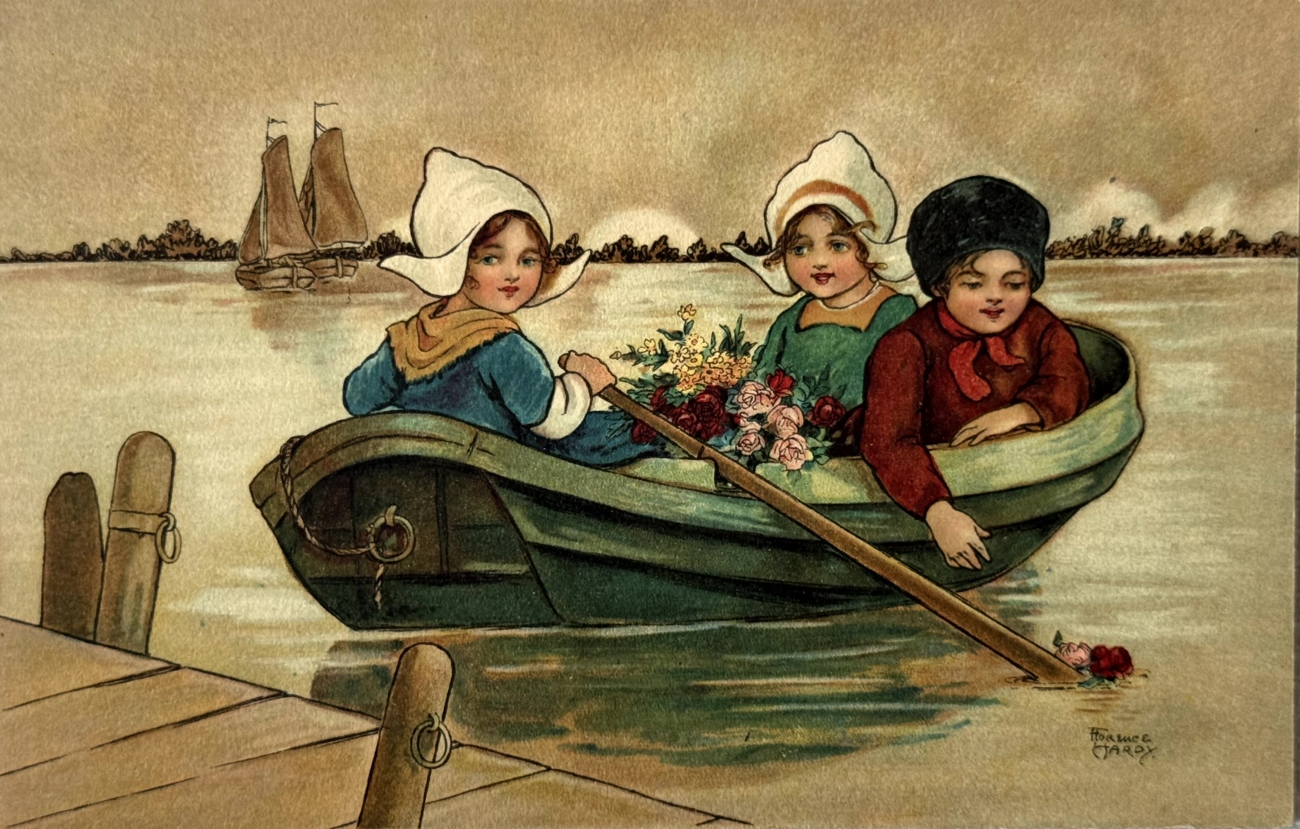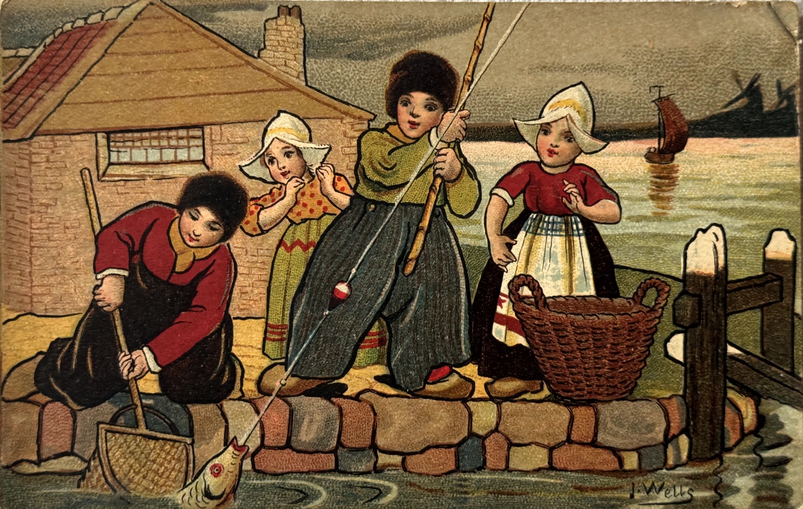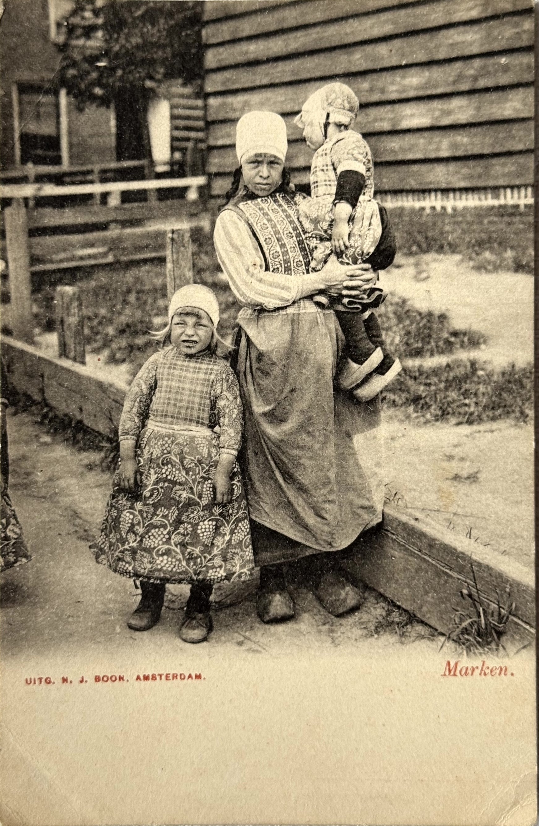 Op een andere kaart zie je dat twee vrouwen iets van textiel in hun handen hebben. De rechter vrouw lijkt iets te doen dat op naaien lijkt. Zou ze een scheur in een schort repareren? Boeiend om zo een inkijk te krijgen in het leven in Volendam rond 1900.