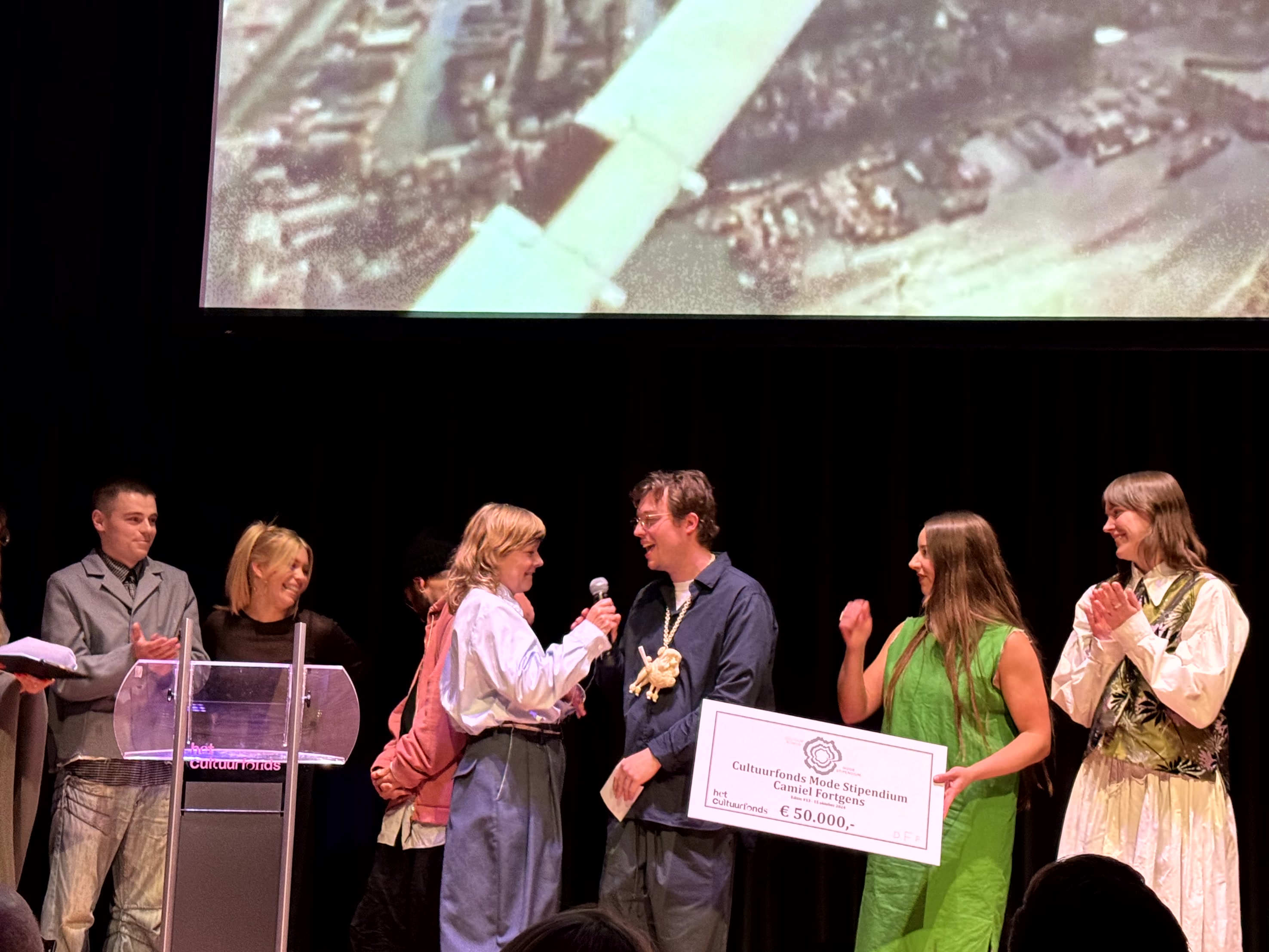 Ik had nog willen schrijven over de winnaar van het Modestipendum 2024 van het Cultuurfonds: ontwerper Camiel Fortgens en zijn team. We waren op 15 oktober van dit jaar bij de uitreiking en ik was verrukt over het werk van deze voor mij onbekende modeontwerper. Na de uitreiking was er ineens een modeshow waarbij de modellen tussen de gangpaden liepen. Een dag later bezochten we zijn studio waar de creativiteit van de muren spatte. Het is kleding die net even wat anders is. Een naad die bewust scheef is gestikt, een colbert met stiksels afgeleid van de krijtstreep of strepen die bewust niet doorlopen.
