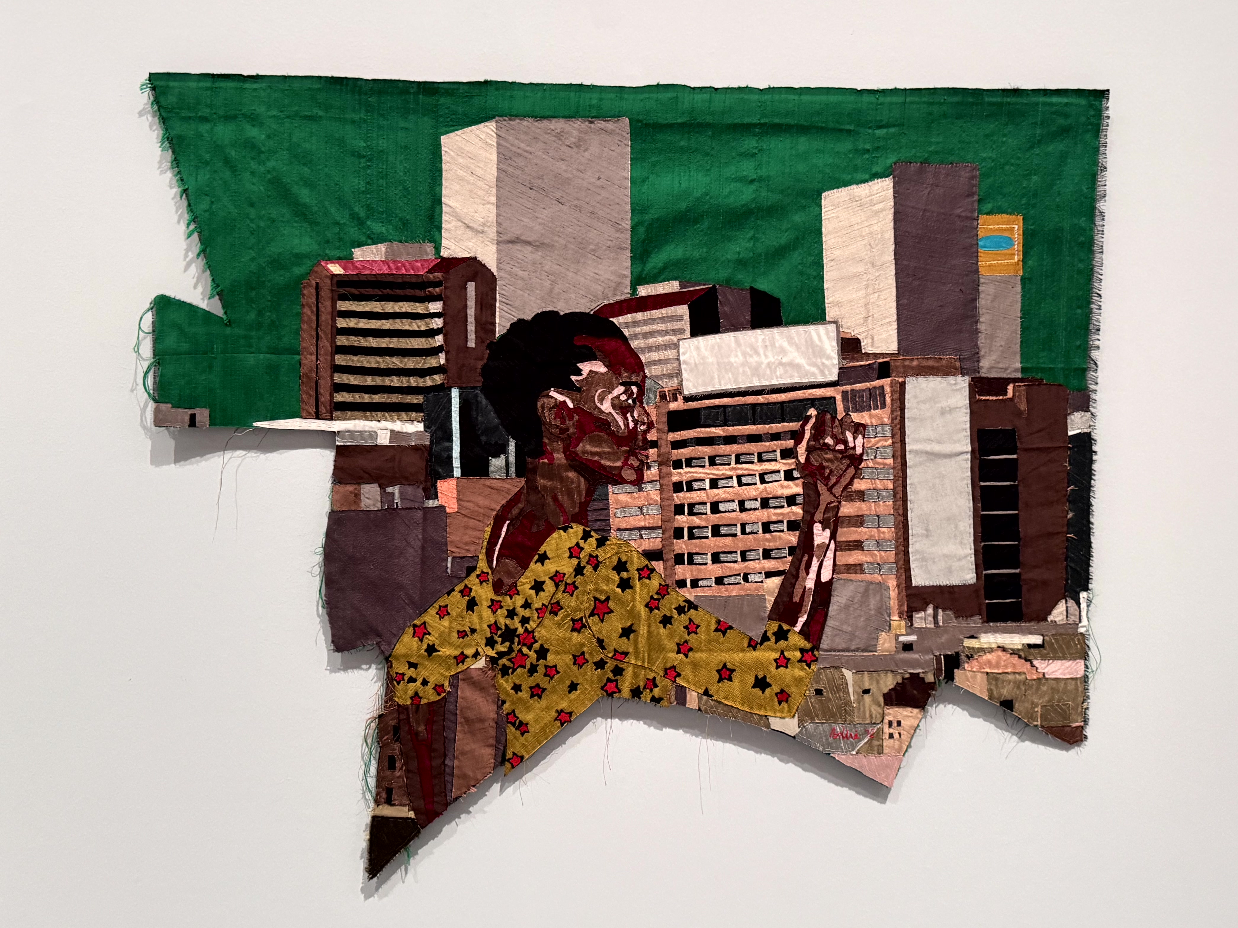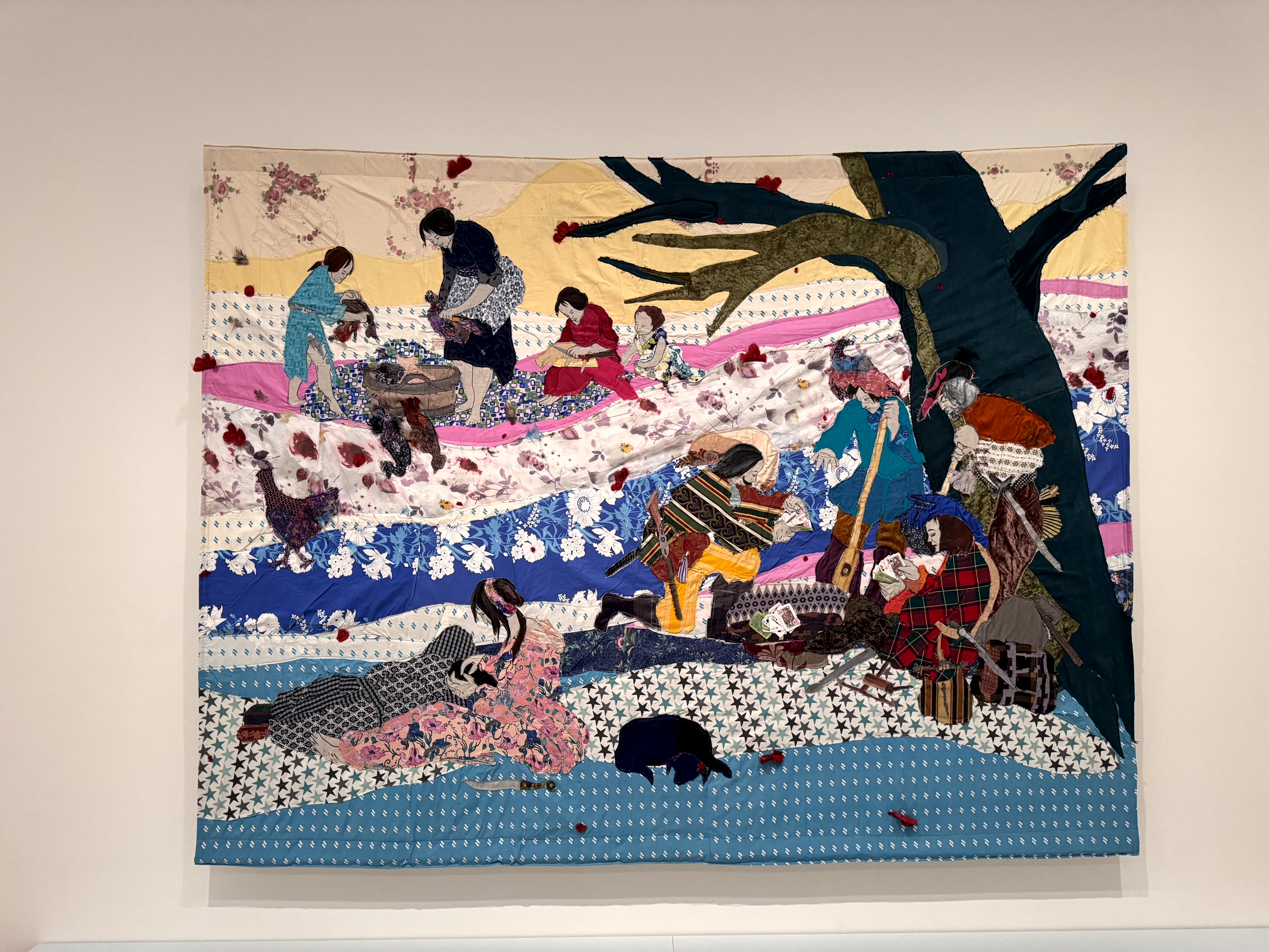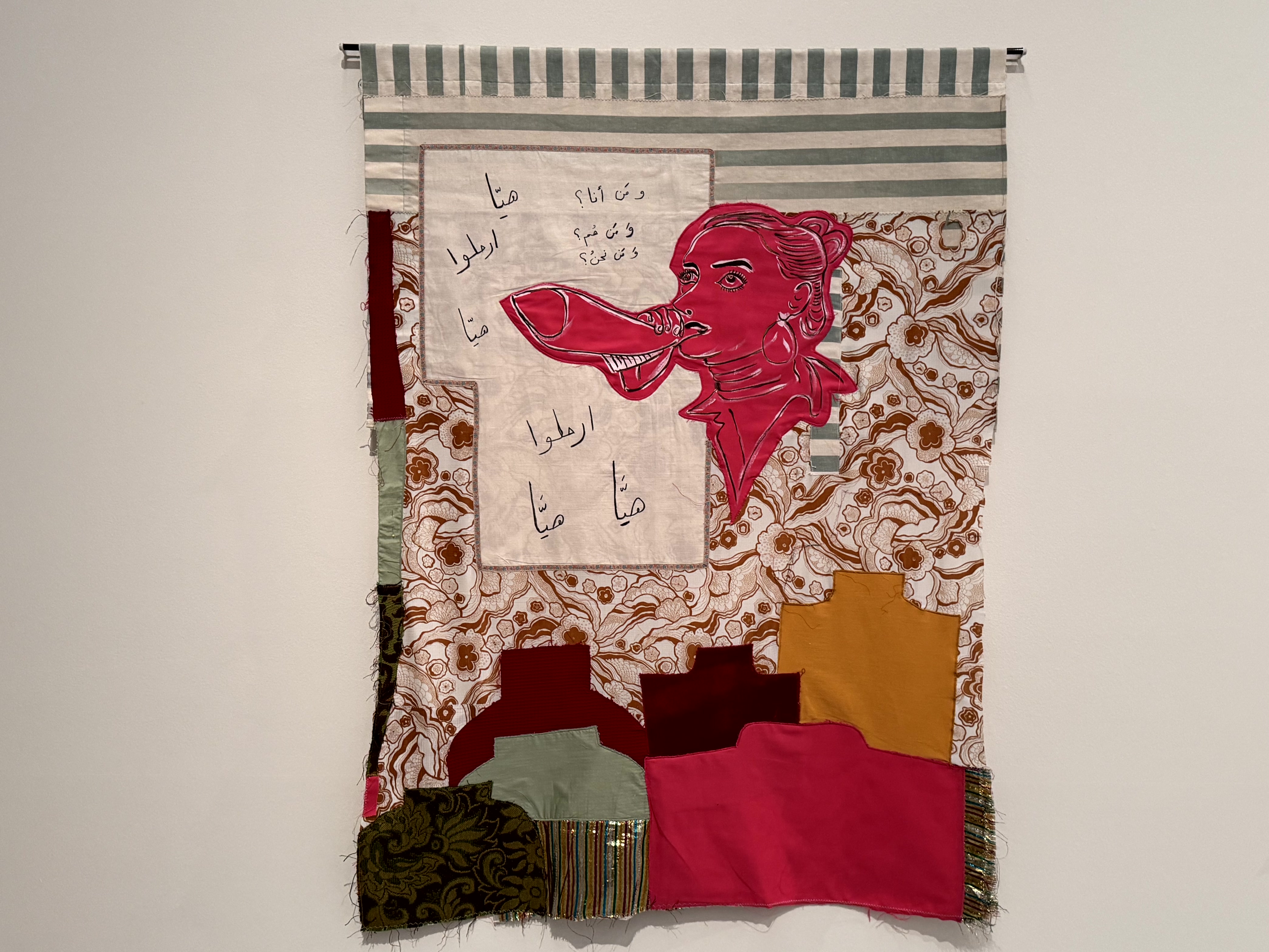 Ook voor mij onbekende namen zoals Yee I-Lann, Kevin Beasly, Mounira Al Solh en Mercedes Azpilicueta . Veel van de werken hebben een activistisch karakter en vertellen verhalen over onderwerpen als racisme, onderdrukking, verzet en het helen van de wonden. Het grootste deel van de expositie is te zien in de kelder van het museum, een grote zaal waar de werken elkaar vaak wegduwen of niet goed uitkomen. Tot mijn grote ergernis is er niets te zien van Nederlandse textielkunstenaars, terwijl het museum een grote collectie textiel bezit en er op dit moment veel Nederlandse kunstenaars met dit materiaal werken. Barbara Broekman, Ellis Schoonhoven, Marian Bijlenga, Claudy Jongstra om er maar een paar te noemen. Die hadden daar ook moeten staan of hangen! Gemiste kans voor een publiek en van een conservator die geen durf laat zien.