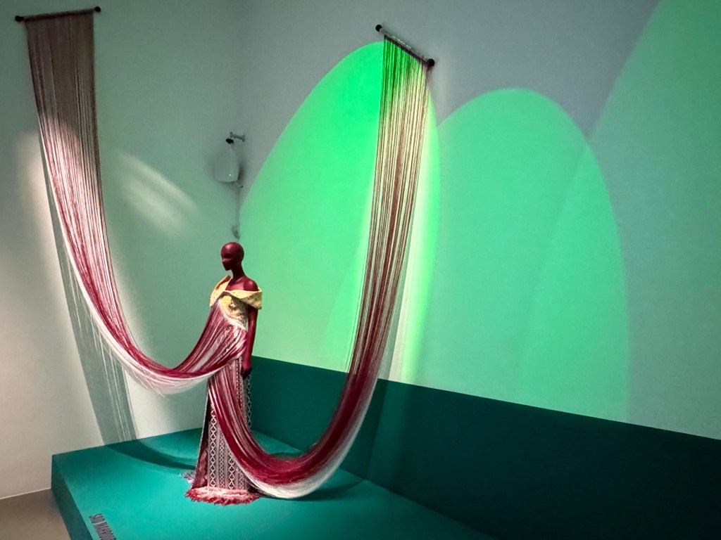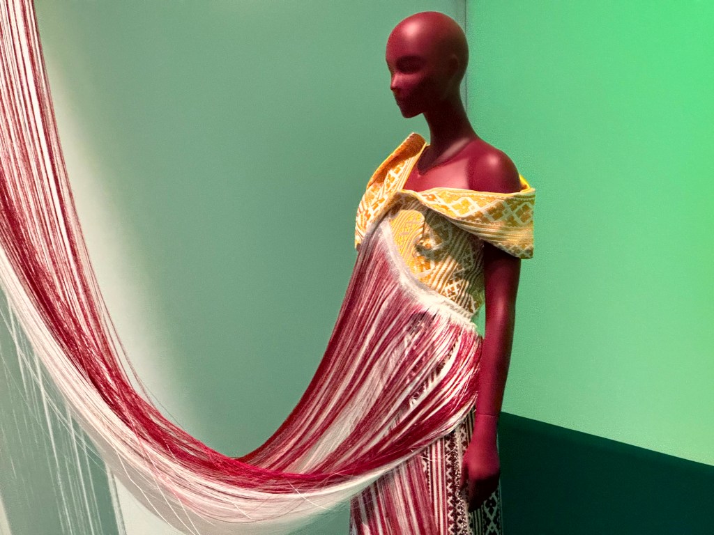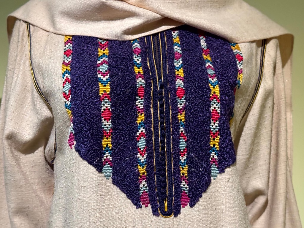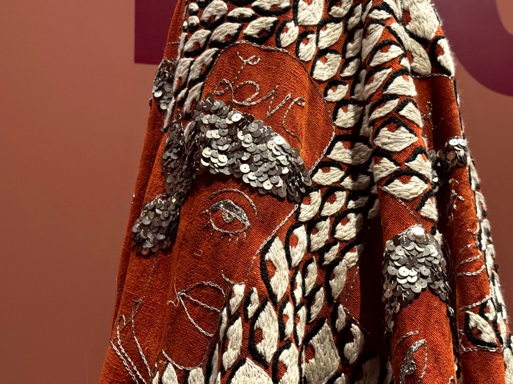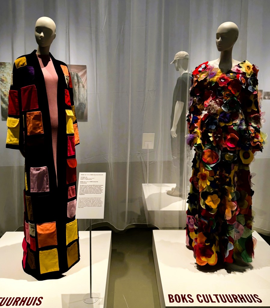 Het is geen bomvolle expositie – ook wel eens fijn- maar de kledingstukken die er staan, vertellen bijzondere verhalen. Mij raakte de combinatie van traditioneel ambacht met moderne kleding.