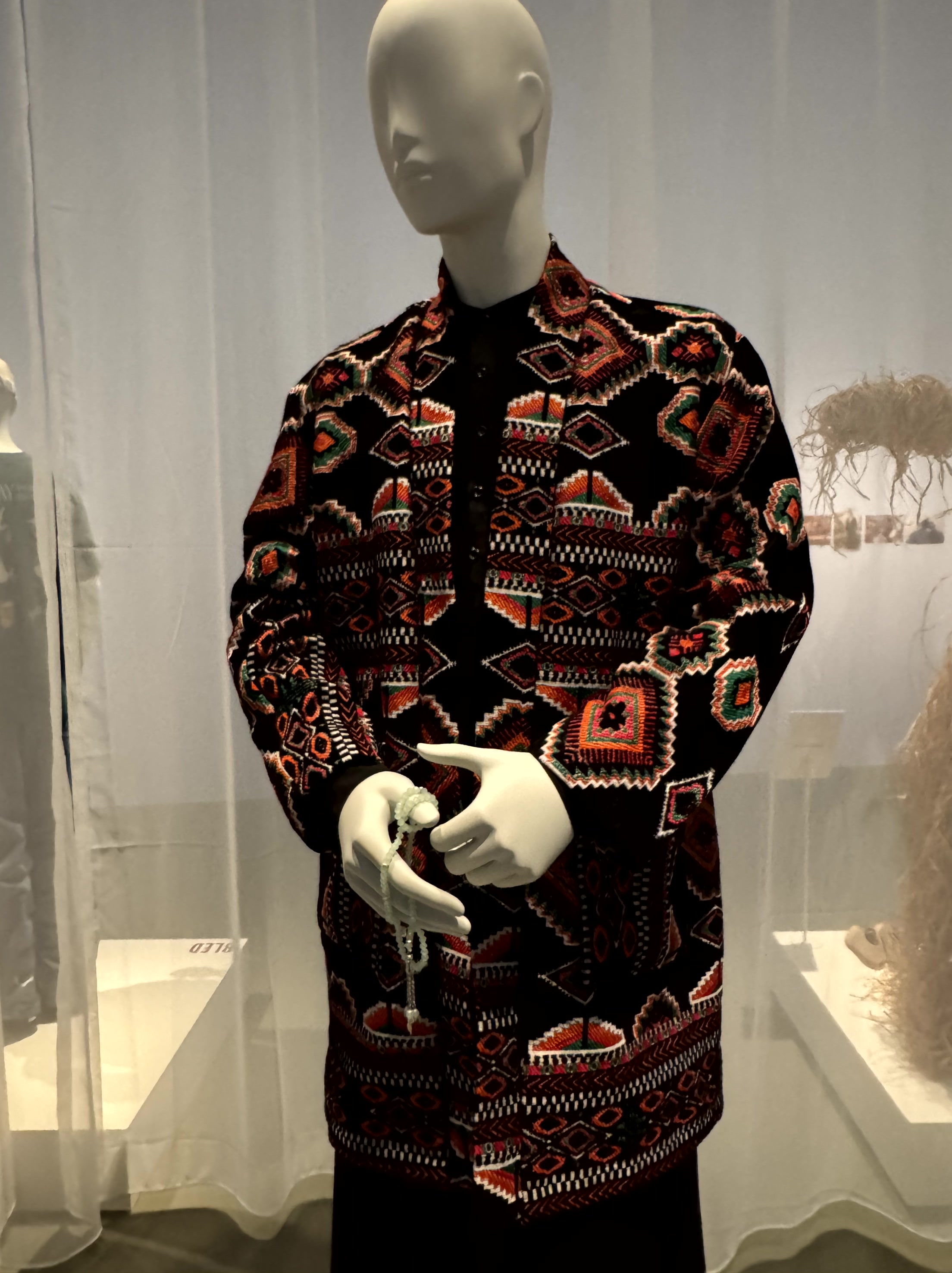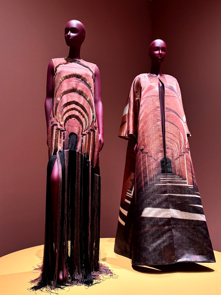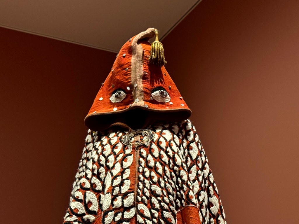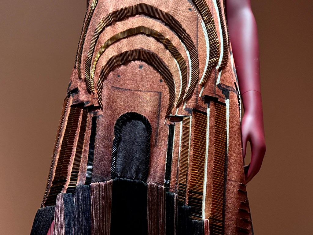 Het is geen bomvolle expositie – ook wel eens fijn- maar de kledingstukken die er staan, vertellen bijzondere verhalen. Mij raakte de combinatie van traditioneel ambacht met moderne kleding.
