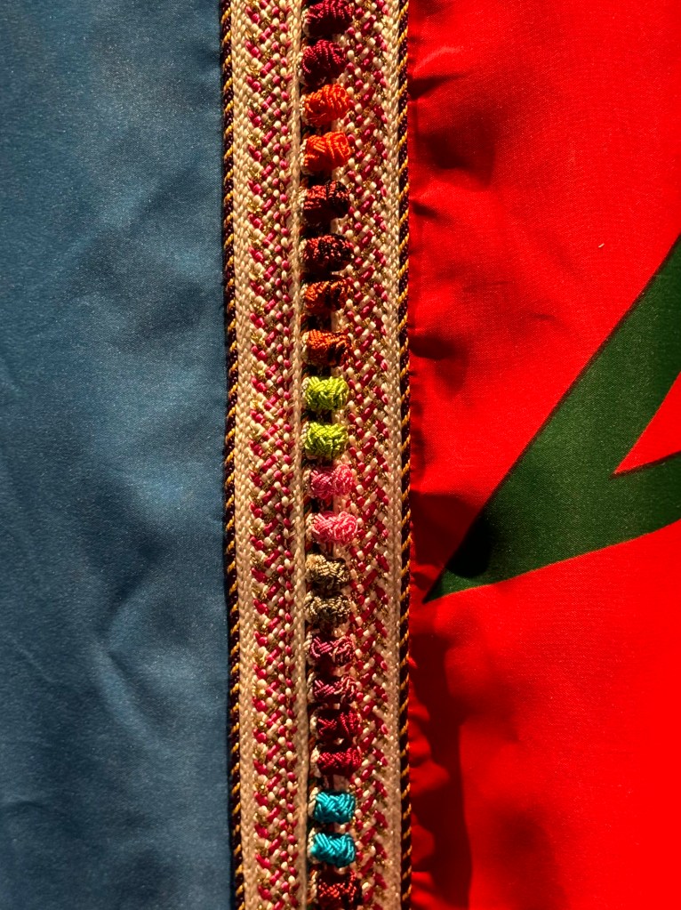 Ogen en gezichten op een grote cape kijken je aan. Ook hier weer de aandacht voor het eigen erfgoed, voor de eigen cultuur, een samengaan van individualiteit en authenticiteit.