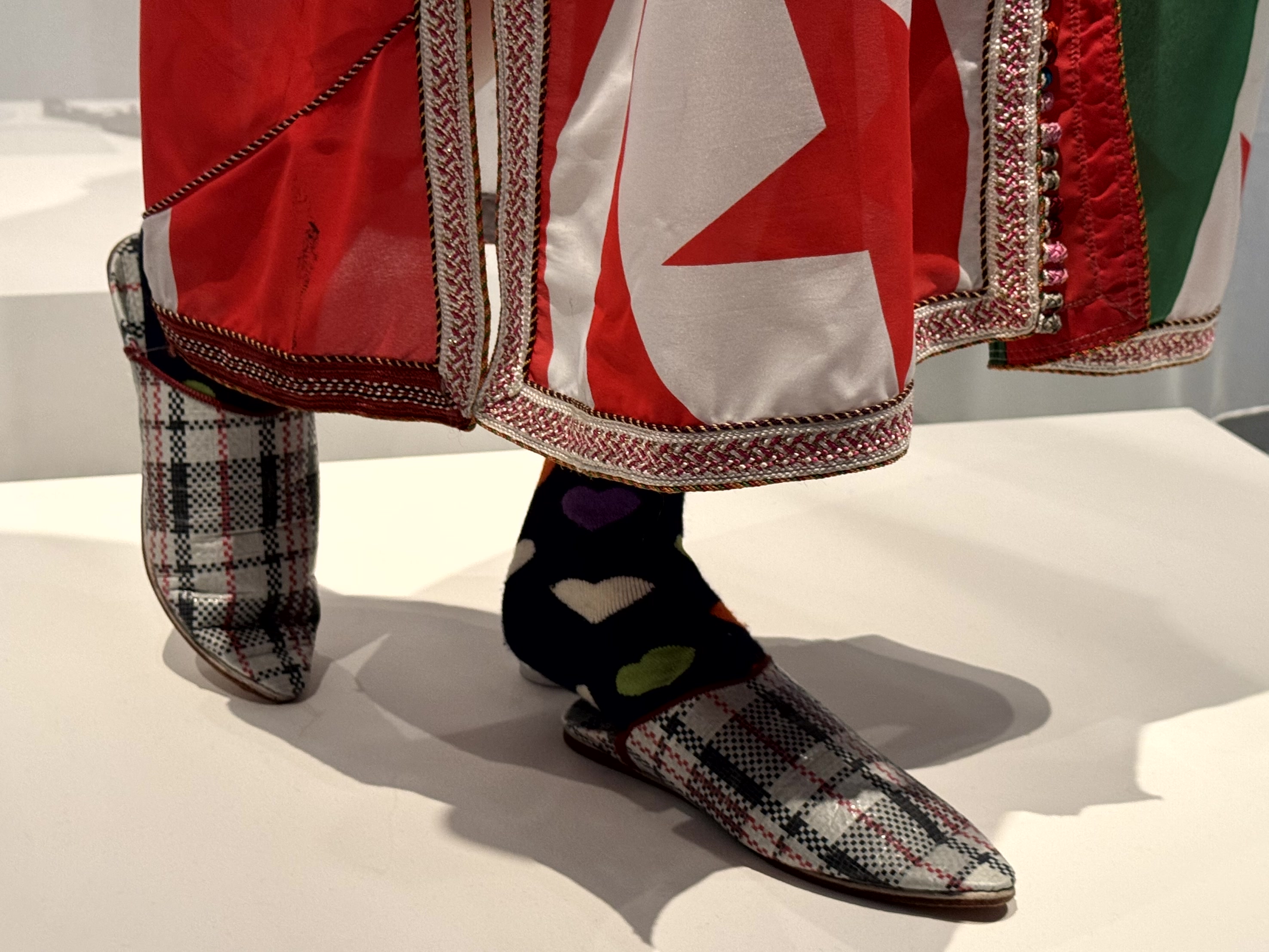 Natuurlijk ken ik de traditionele Marokkaanse sloffen, babouches genoemd. Op de foto’s, gemaakt door Hassan Haijaj dragen de modellen ‘streetstyle’ kleding vol kleurrijke Marokkaanse stijlelementen. Daaronder babouches die gemaakt zijn van de bekende geruite plastic tassen.